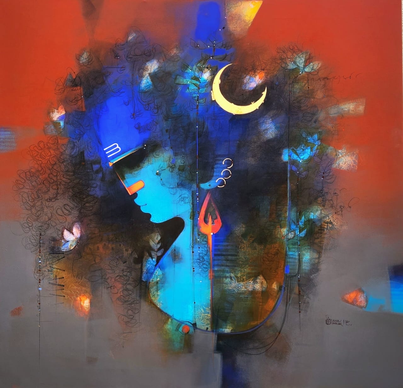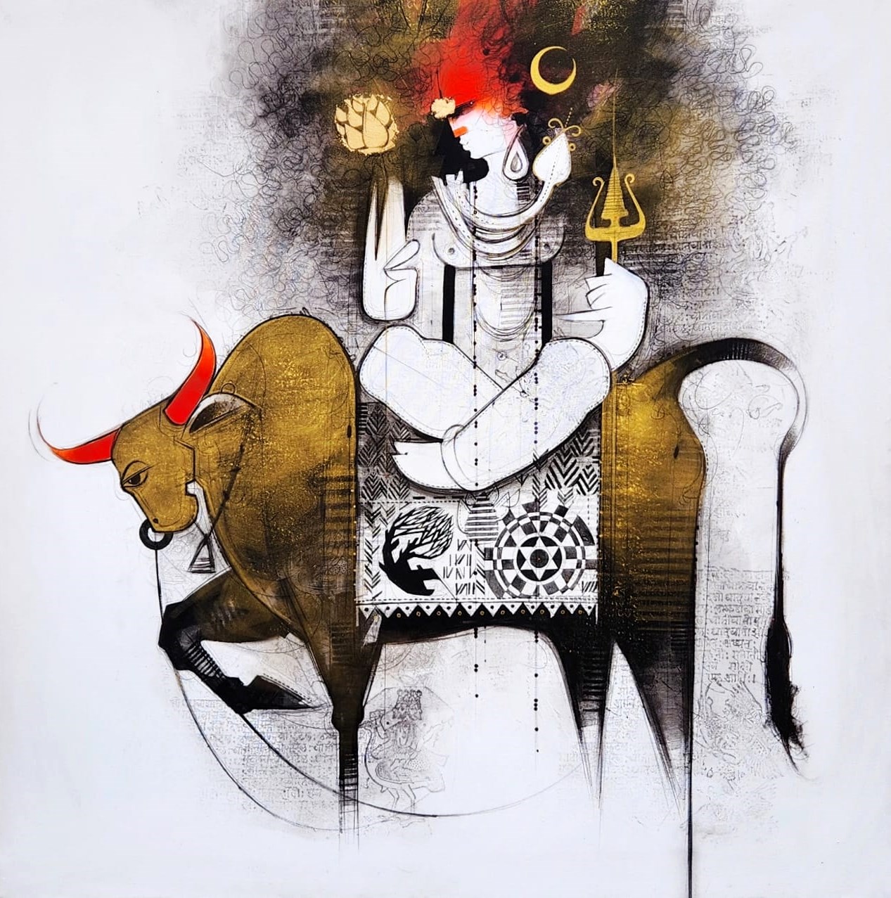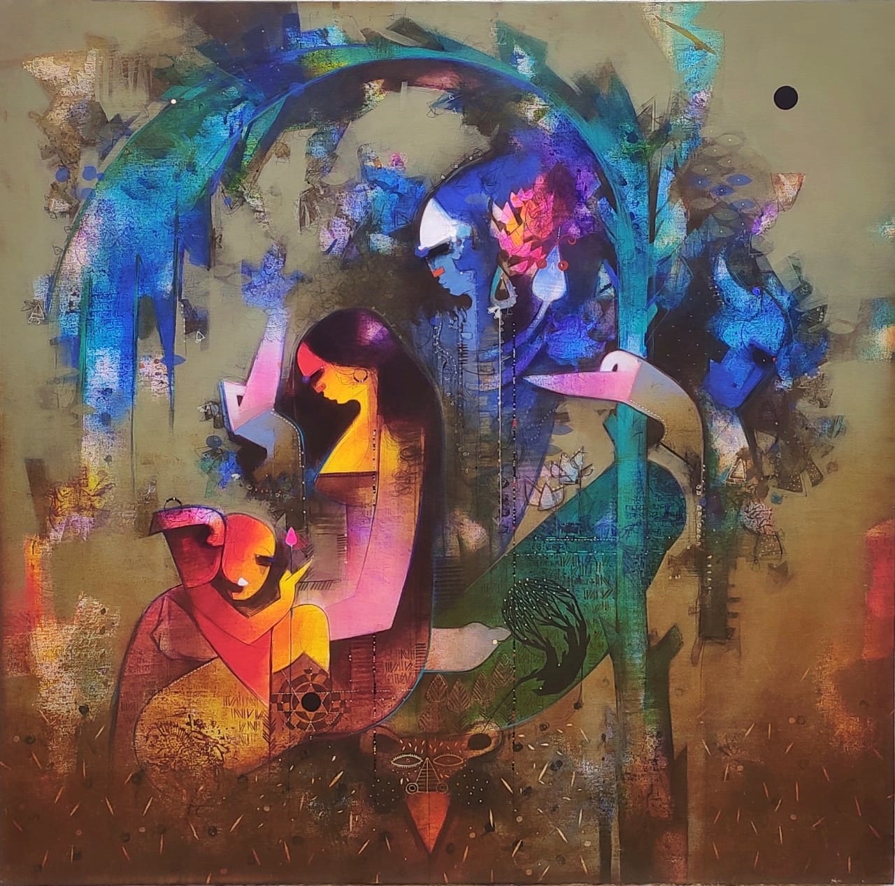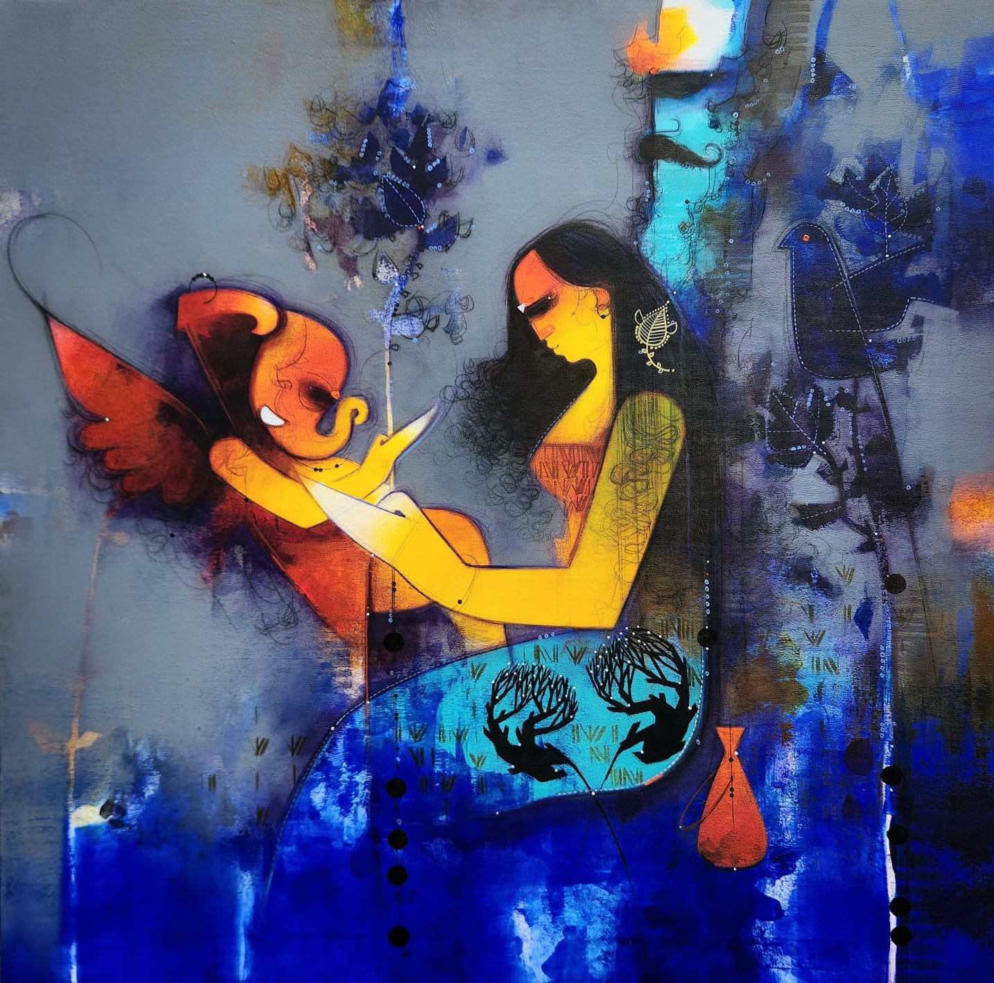 Amol Pawar's artworks have a magical narrative flavor with subjects from inspired from mythology, reminiscent of the stories of gods and goddesses, especially the element of Shakti that represents the intensity of eternal love. Pawar fuses the traditional with a unique contemporary mystique infused with icons, symbols, line drawings, calligraphy, miniature paintings, graphic elements and textures, all of which make his art an immensely enjoyable experience. His deep connection with nature in the form of flora and fauna further accentuates the vibrant appeal of his beautiful compositions.