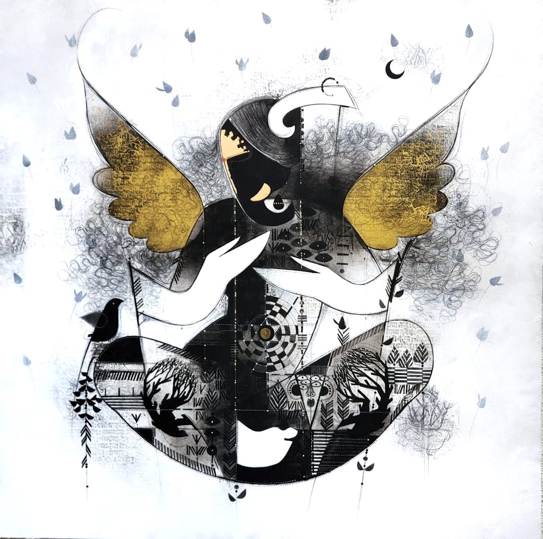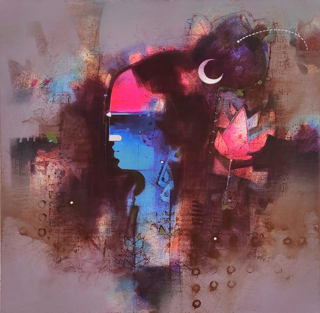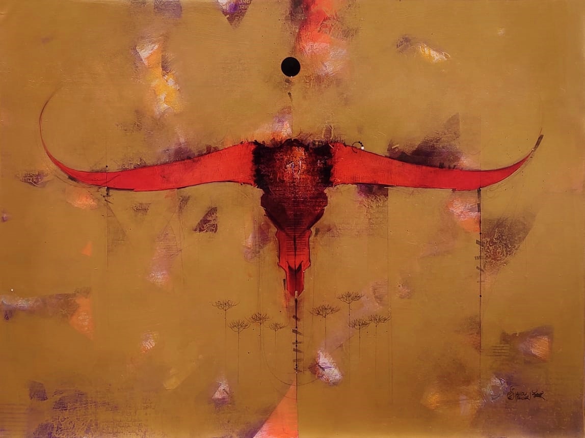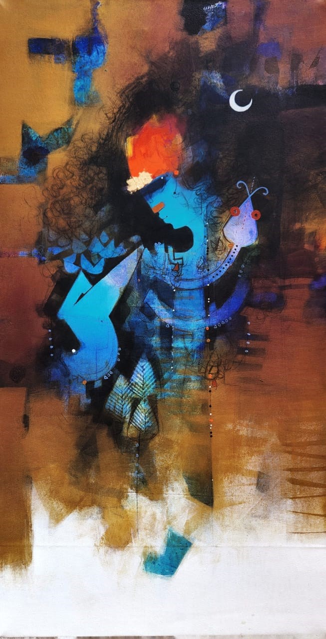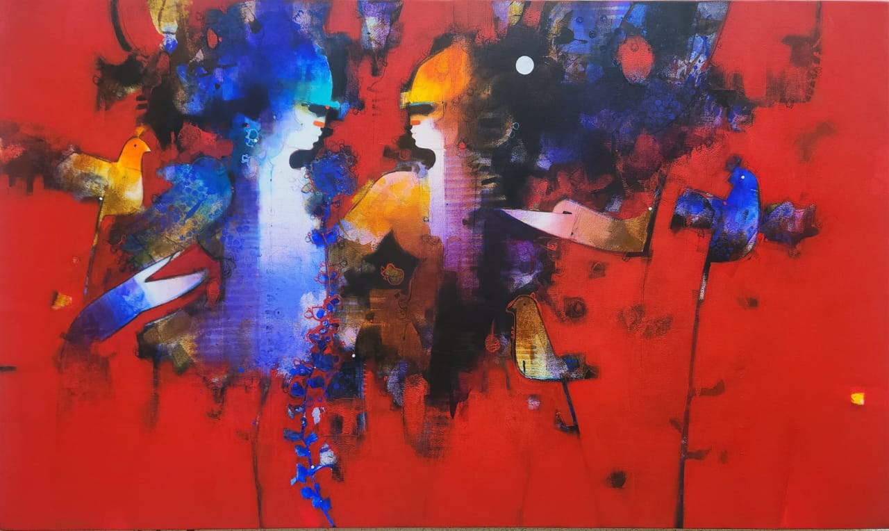 Amol Pawar's artworks have a magical narrative flavor with subjects from inspired from mythology, reminiscent of the stories of gods and goddesses, especially the element of Shakti that represents the intensity of eternal love. Pawar fuses the traditional with a unique contemporary mystique infused with icons, symbols, line drawings, calligraphy, miniature paintings, graphic elements and textures, all of which make his art an immensely enjoyable experience. His deep connection with nature in the form of flora and fauna further accentuates the vibrant appeal of his beautiful compositions.