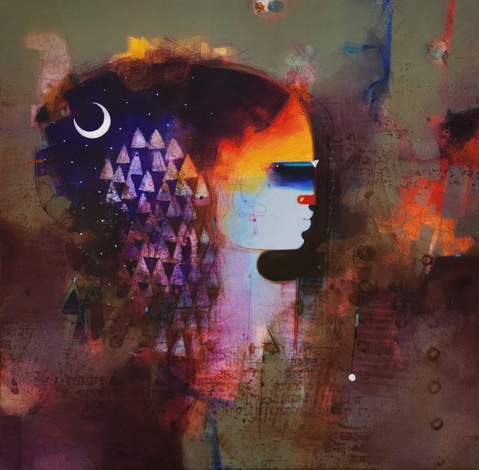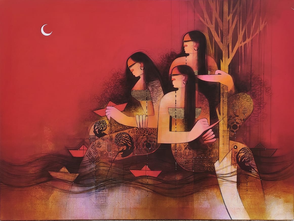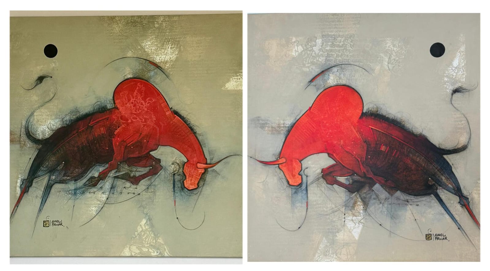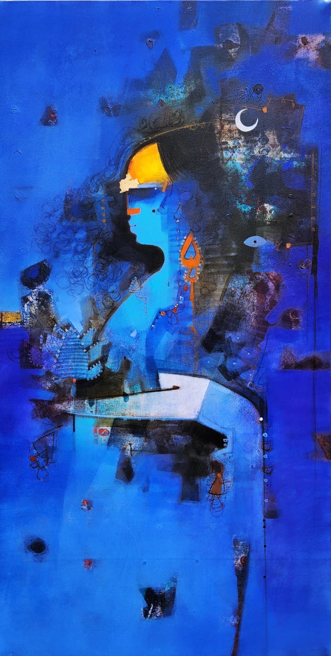 Amol Pawar's artworks have a magical narrative flavor with subjects from inspired from mythology, reminiscent of the stories of gods and goddesses, especially the element of Shakti that represents the intensity of eternal love. Pawar fuses the traditional with a unique contemporary mystique infused with icons, symbols, line drawings, calligraphy, miniature paintings, graphic elements and textures, all of which make his art an immensely enjoyable experience. His deep connection with nature in the form of flora and fauna further accentuates the vibrant appeal of his beautiful compositions.