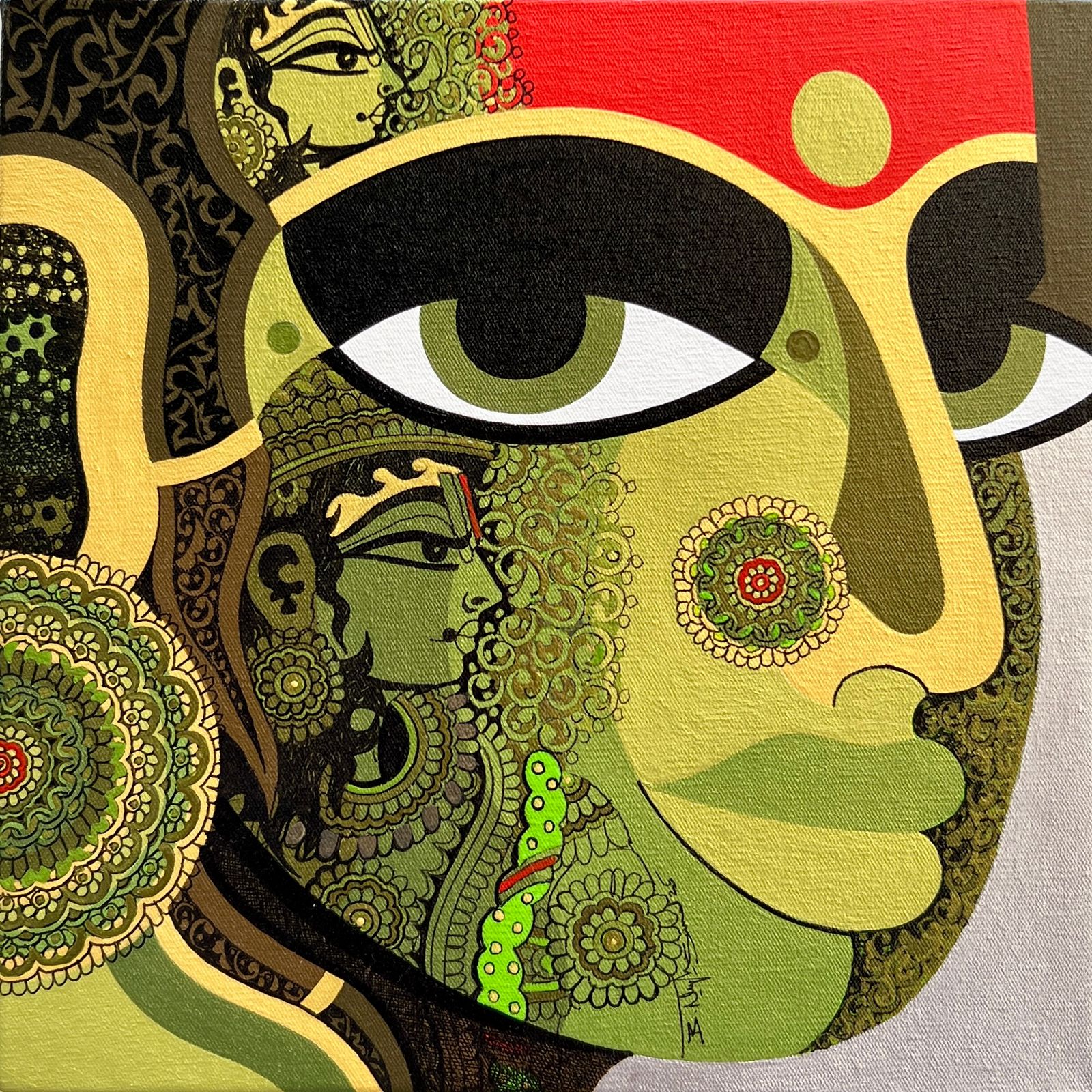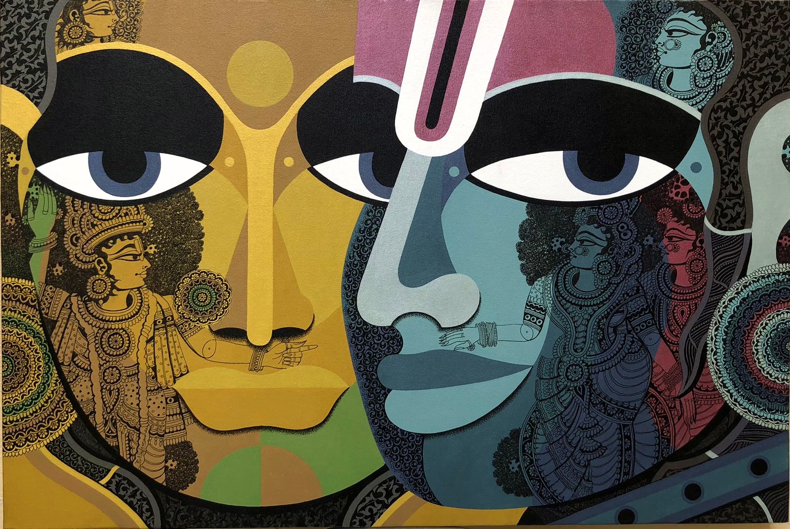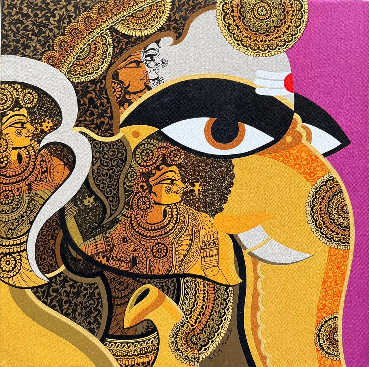 Award winning gold medallist artist Nagesh Goud from Hyderabad, is renowned for creating remarkable artworks inspired by the great Indian epics - the Mahabharata and the Ramayana. His stylized paintings encompass the figurative, semi-abstract and abstract forms. Ancient stories from mythology are an inherent part of the artist's repertoire. Symbols from the famous epics are used to adorn the protagonists and illustrate the narratives. Using defined curvaceous forms, strong colours and sharpened features, Nagesh Goud creates visually stunning artworks where the intricate narrative is highlighted as much as the main figure. Monochromatic hues are contrasted with vivid shades to create a sense of depth.