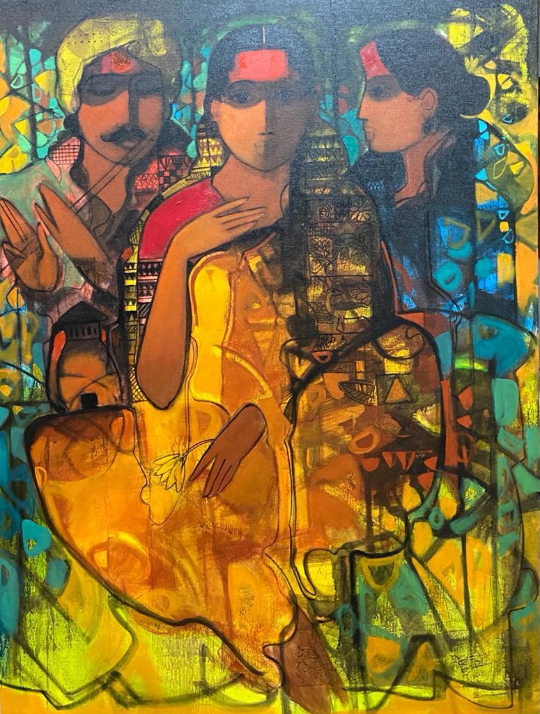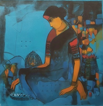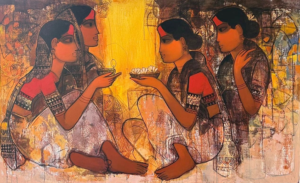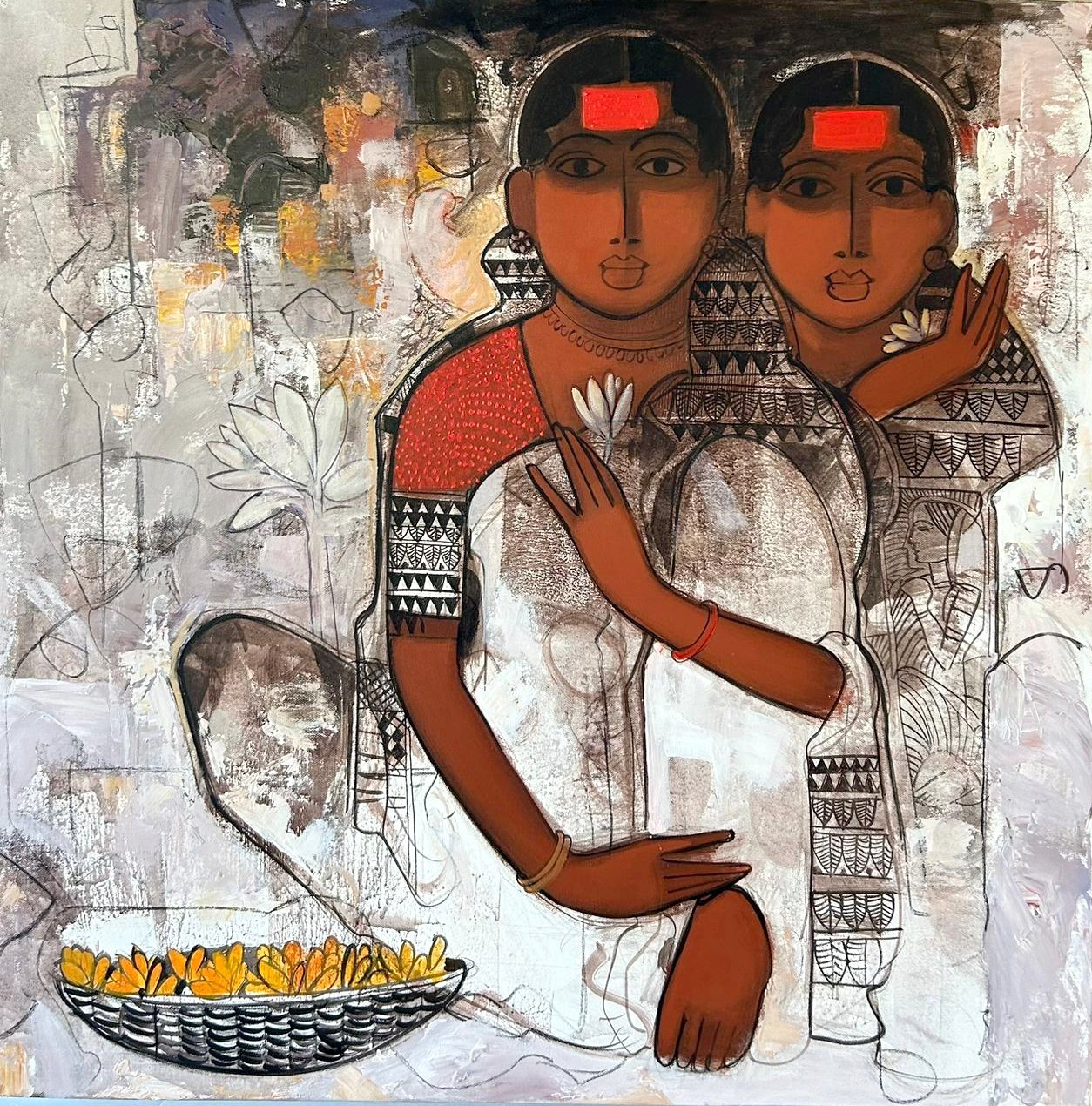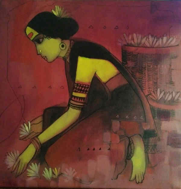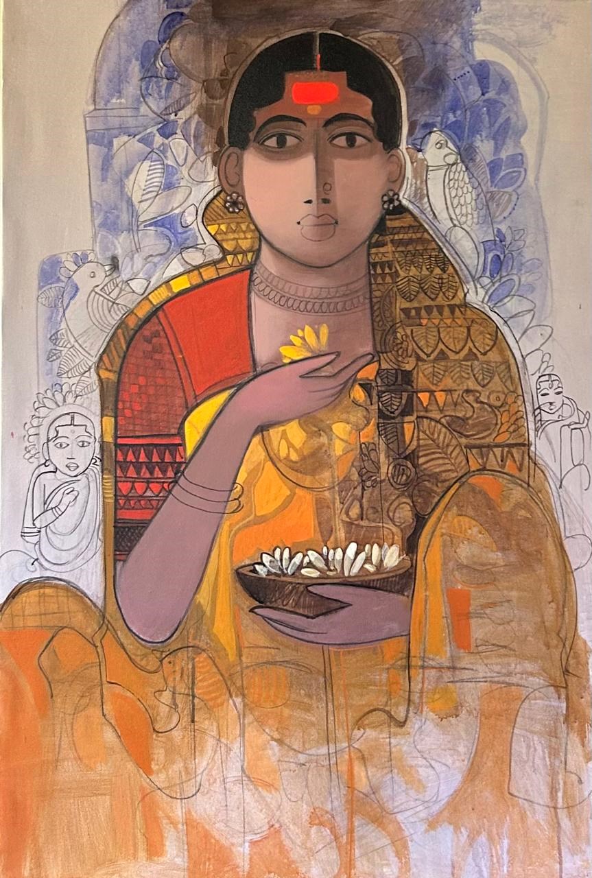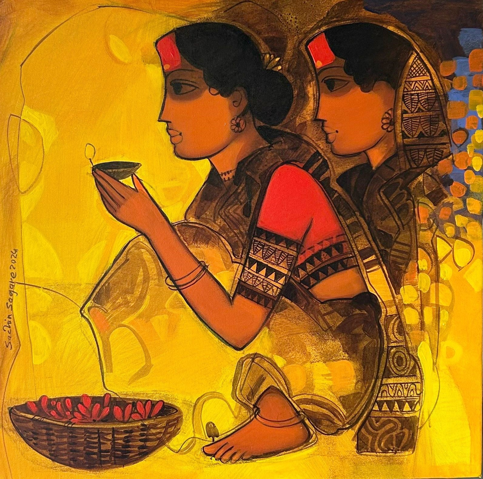 With the strong belief that women play a vital role in shaping the values and culture of a society, Sachin Sagare's artworks pay tribute to female figures he has been inspired by. His works are simple, honest renditions of the myriad expressions and unexpressed voices of women. Using delicate lines and vibrant hues, Sachin depicts rustic scenes of village life in his distinct, contemporary style. He highlights the intrinsic innocence of young women who are shown waiting outside a temple, selling fresh flowers for offering to the Deity. All dressed up with vermillion on their foreheads, they appear like Goddesses themselves.
