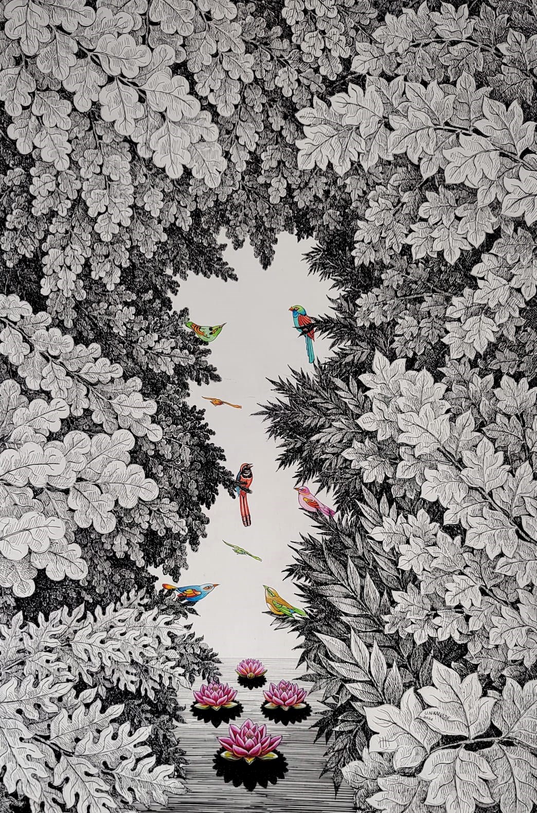 Working primarily in ink on canvas, Umakant Kanade's paintings usually depict elements of nature in their most bare and basic forms. The artist strives to bring out the texture of each rock or bird that he portrays through minute strokes. "Observing tones and colours and then converting them into black and white is a difficult task." But it results in stunning compositions, as we can all see.
