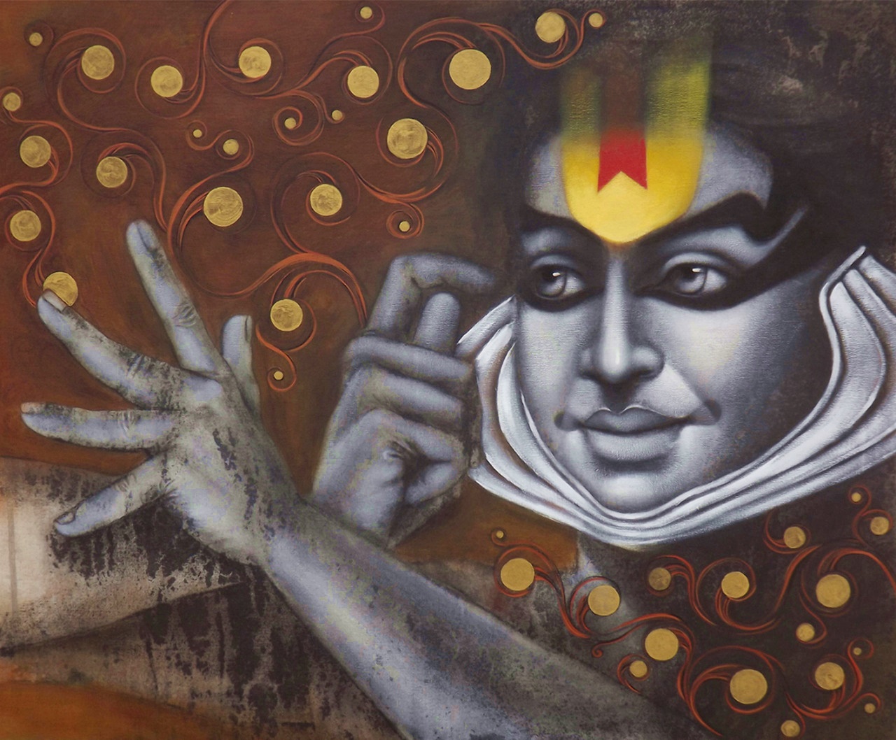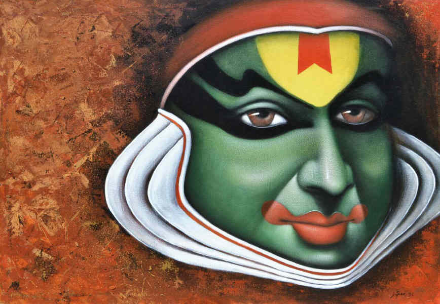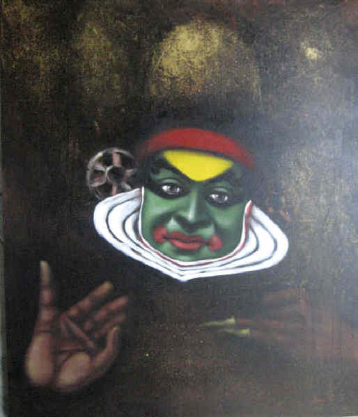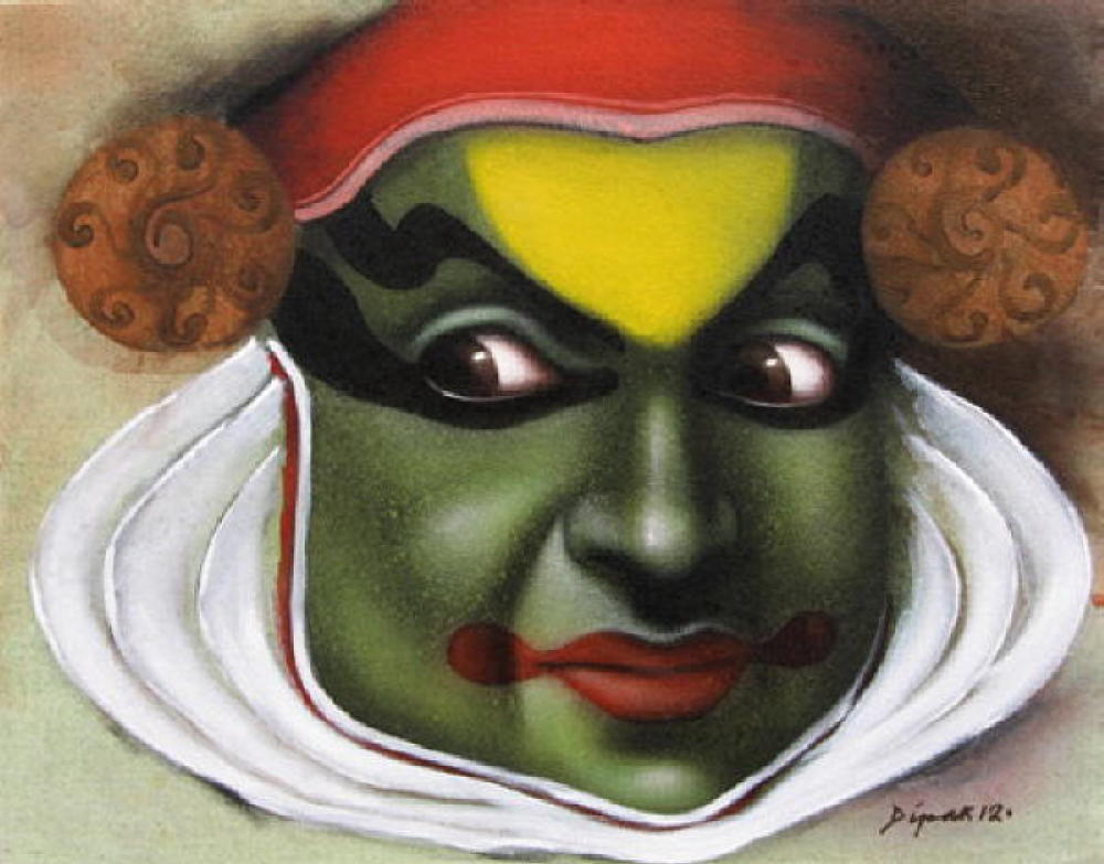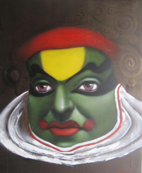 Artist Dipak Roy's canvases are inspired from the diverse and emotive facial expressions of Indian classical dances, especially Kathakali. The vibrant green colour of a Kathakali Dancer`s face and the brightness of their eyes fascinate him. His aim is to capture the essence and colours of India through these vibrant compositions.