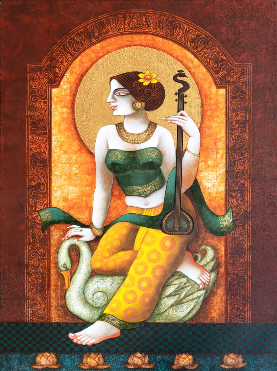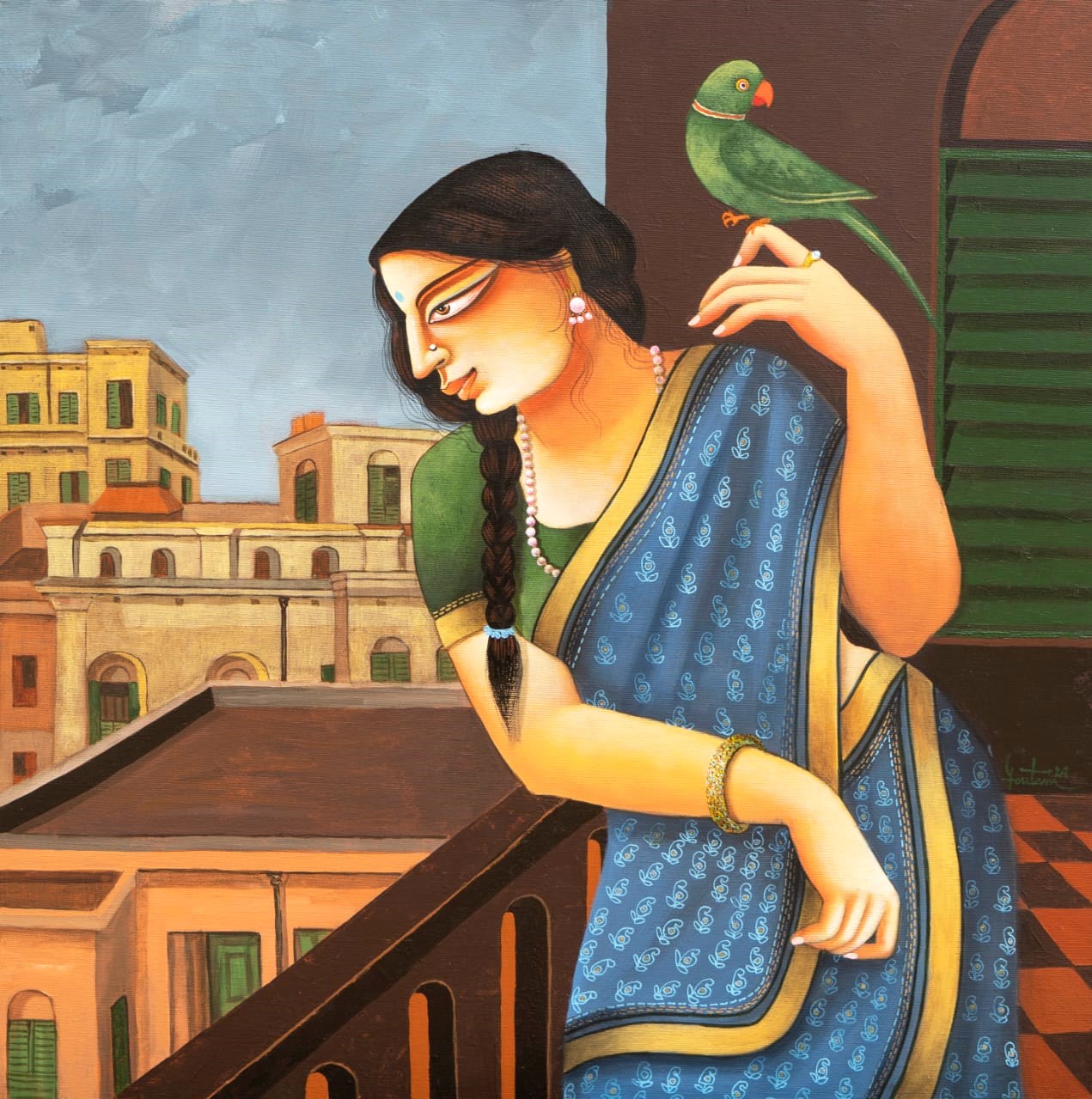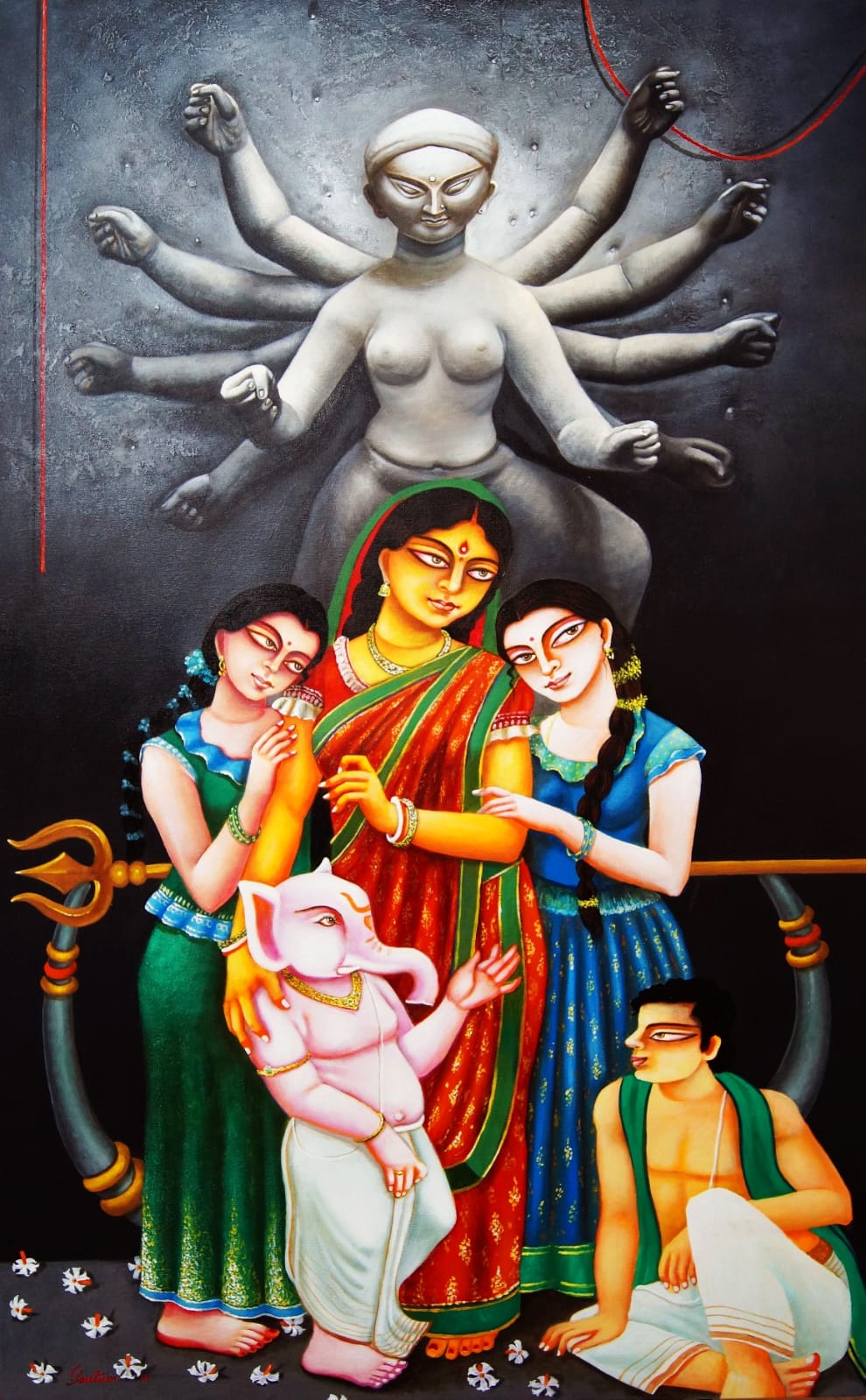 Gautam Mukherjee is sensitive towards his subjects, representative of family values and close bonding as reflected in his latest compositions. Over a period of time Mukherjee's style has evolved, the colors have brightened; the characters have acquired a cheerful tone. The attention to composition, background, detailing of traditional Bengali attire and jewellery in an environment that is reminiscent of the old Kolkata havelis is enhanced by the deep and rich hues of color.