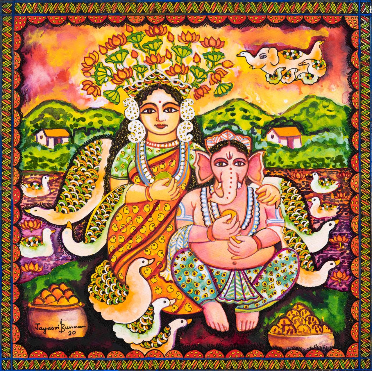 The imagery in Jayasri Burman`s work has a dream-like and lyrical quality with a unique sensitivity which, although inspired by the Indian folk element, retains a quality of refreshing candour and reflective honesty, that is as original as it is endearing. She manages very successfully to weave the decorative and design element of the folk idiom into the intricate patterns of her canvas, without losing the natural charm and naivete of her work, which is uniquely her own.