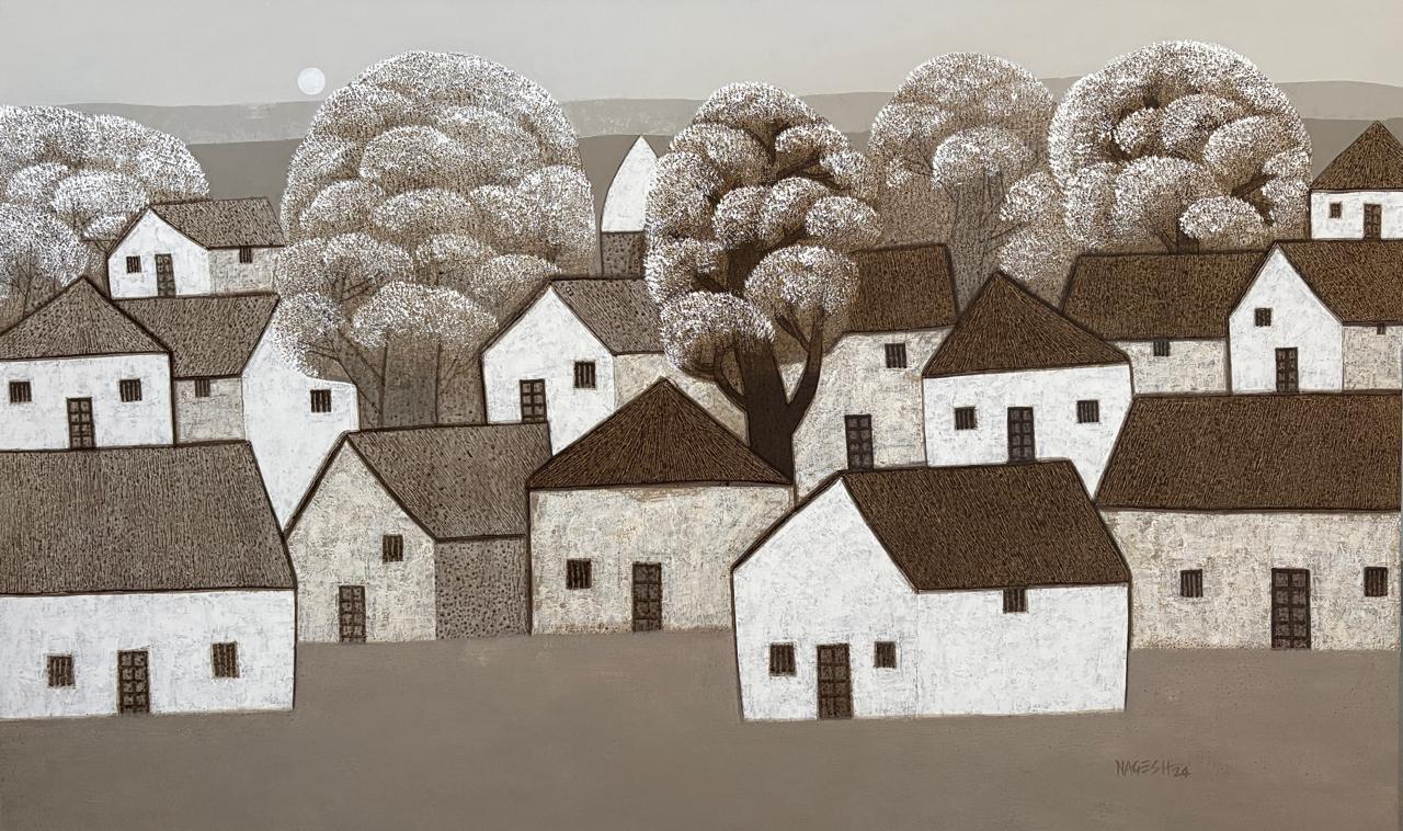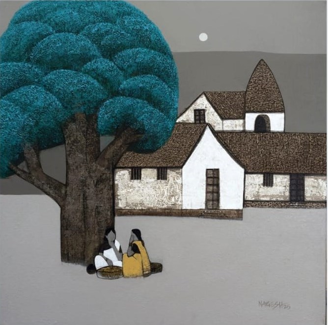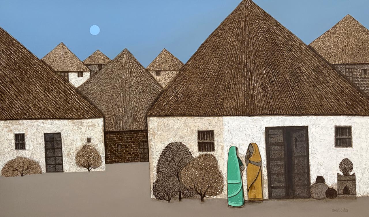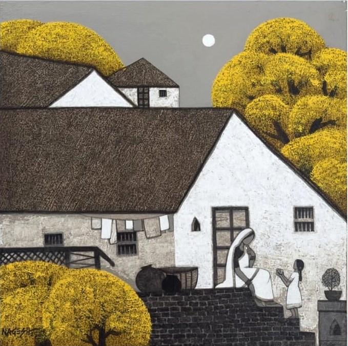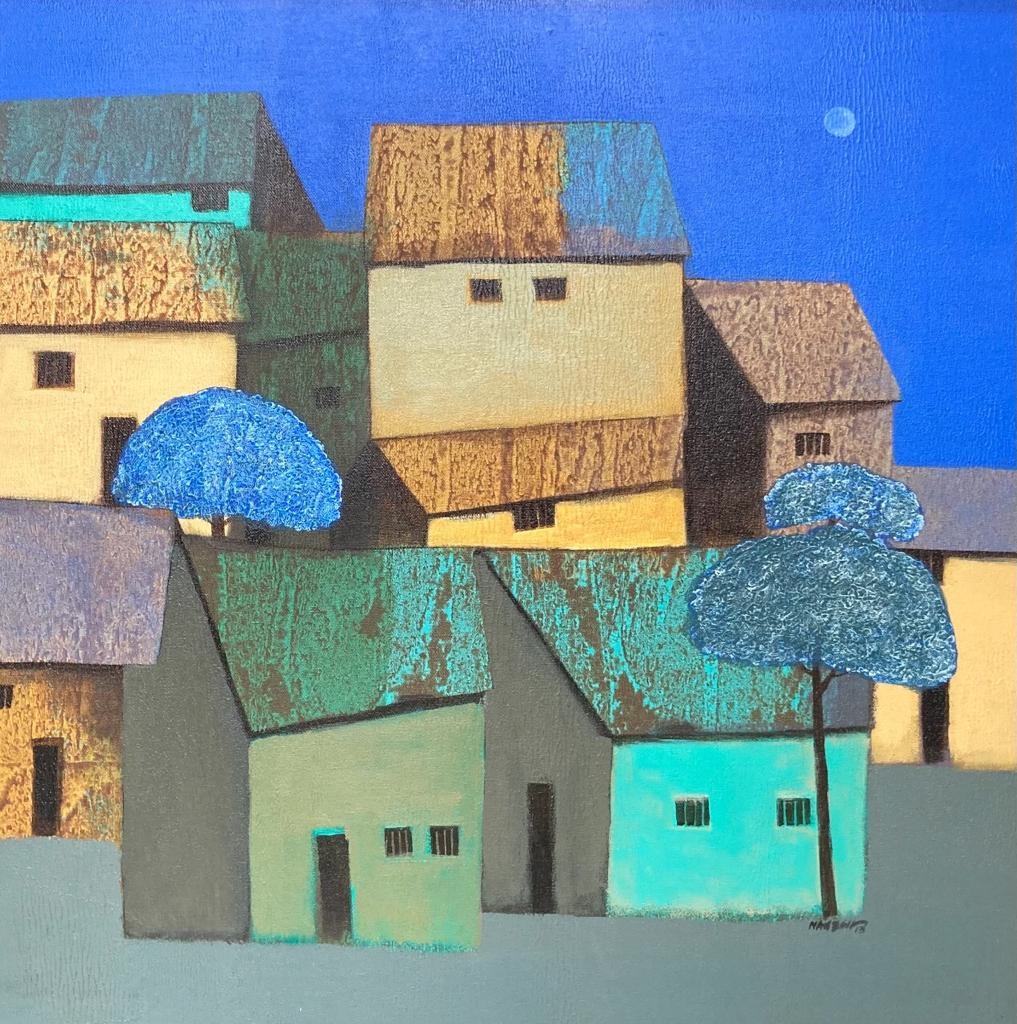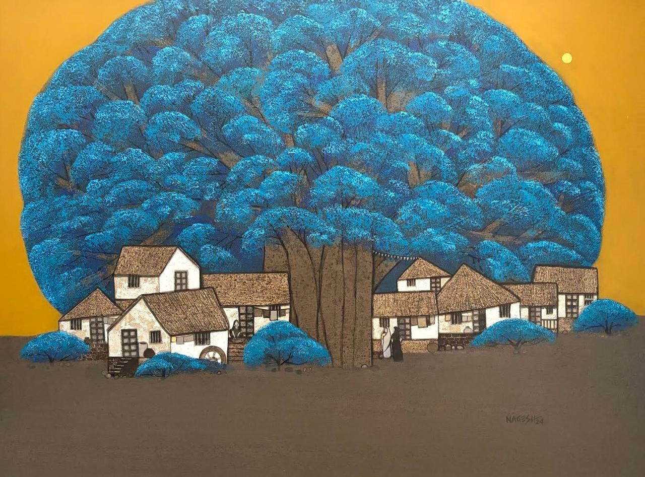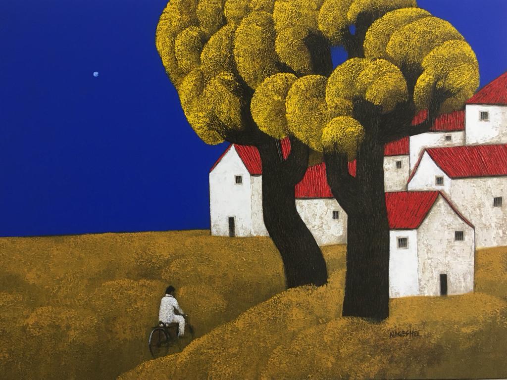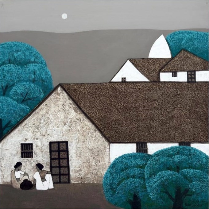 Nagesh Ghodke from Mumbai is renowned for his simple, childlike village scapes against the backdrop of nature, in the simplest, most aesthetic style. Indian villages have a pristine beauty to them, which is remarkably riveting. If one is looking for something that captures the very essence of an abstract representation of villages drenched with greens, blues and reds, this sought after artist's sublime works with an unspoiled purity would be the best choice.