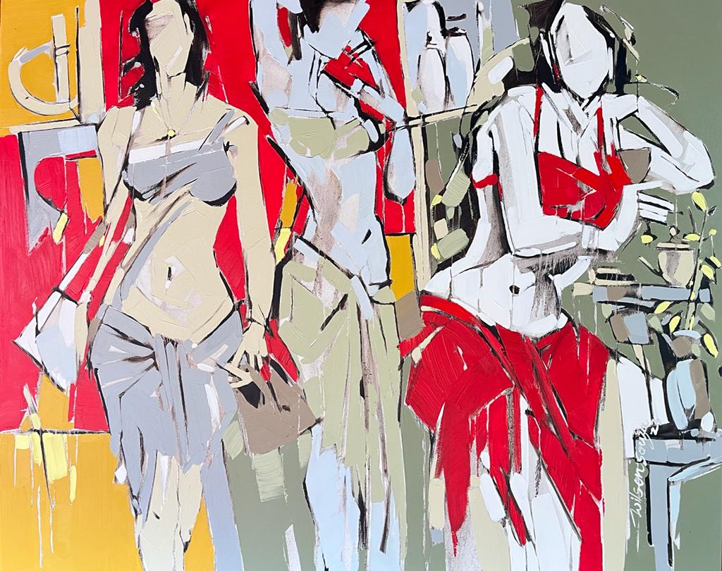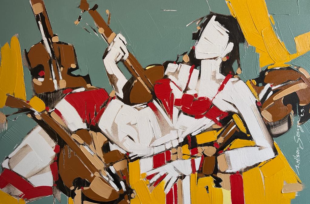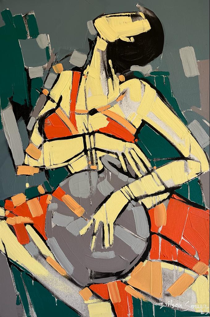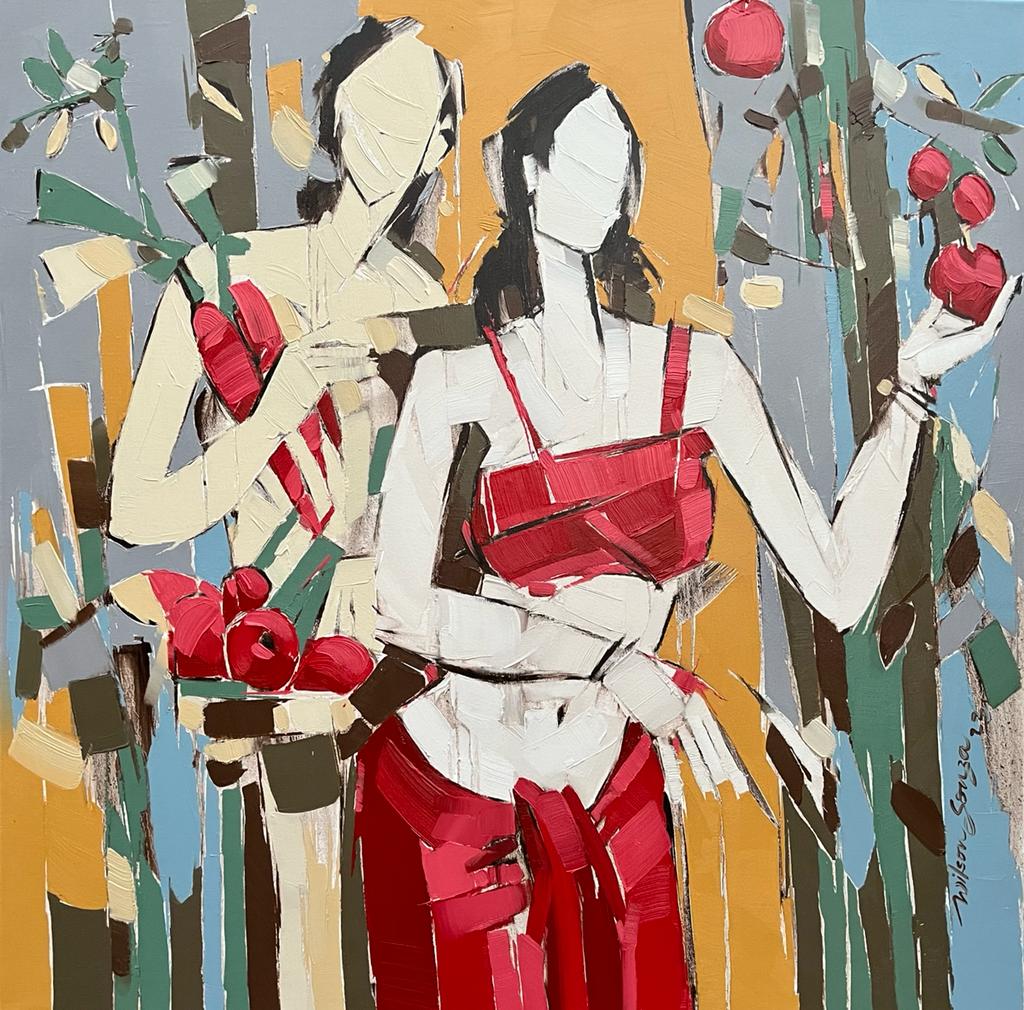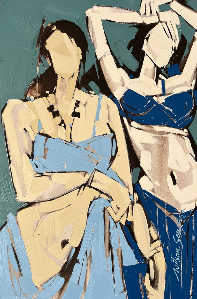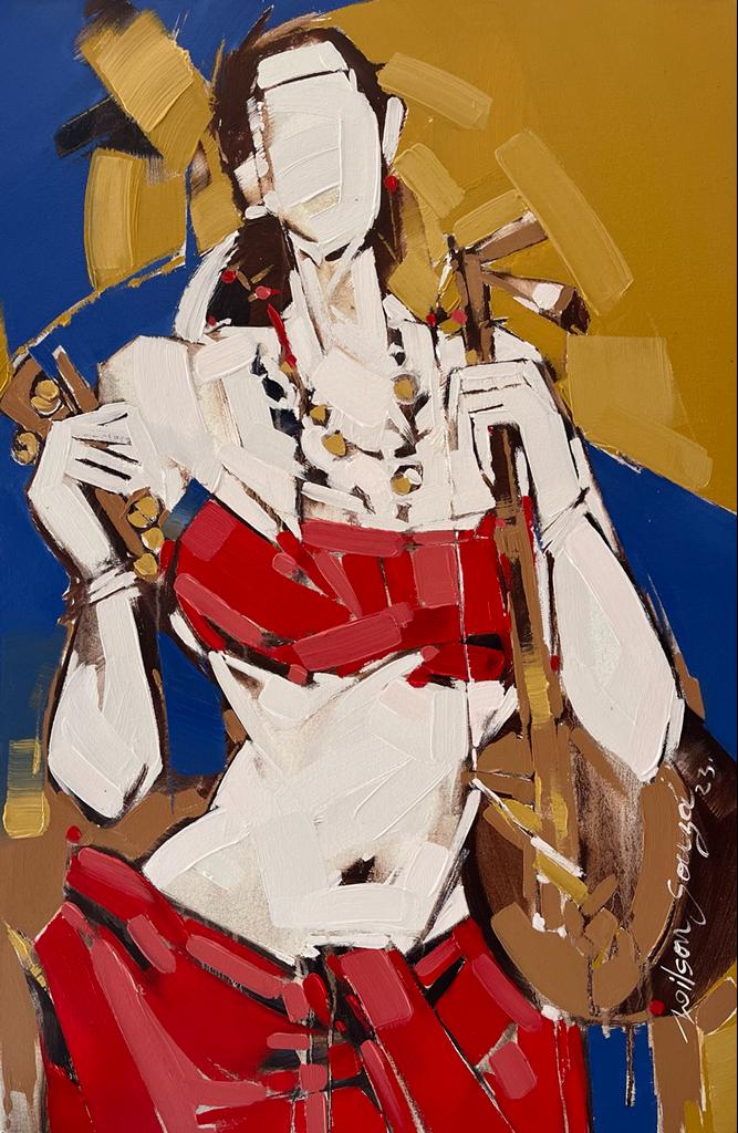 Artist Wilson Souza's romance with feminine themes has become his trademark narrative style, characterized by semi abstract strokes of bold colours, rendering it with amalgam of fantasy and reality. There is slightly exaggerated abundance of sensuality of female form, without defying the tenets of aesthetics. The grandiosity of the feminine beauty and the comparisons to equate beauty and women seem to have worked magic on the canvas. Semi- nude figures stand as a metaphor for truth, devoid of superfluities. The visual representation of form often makes one to fantasize to a certain extent and satiates the need to search for perfect form, as visible in his canvases.