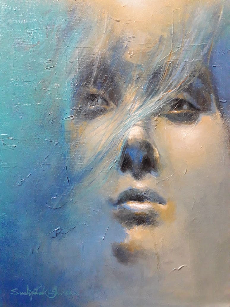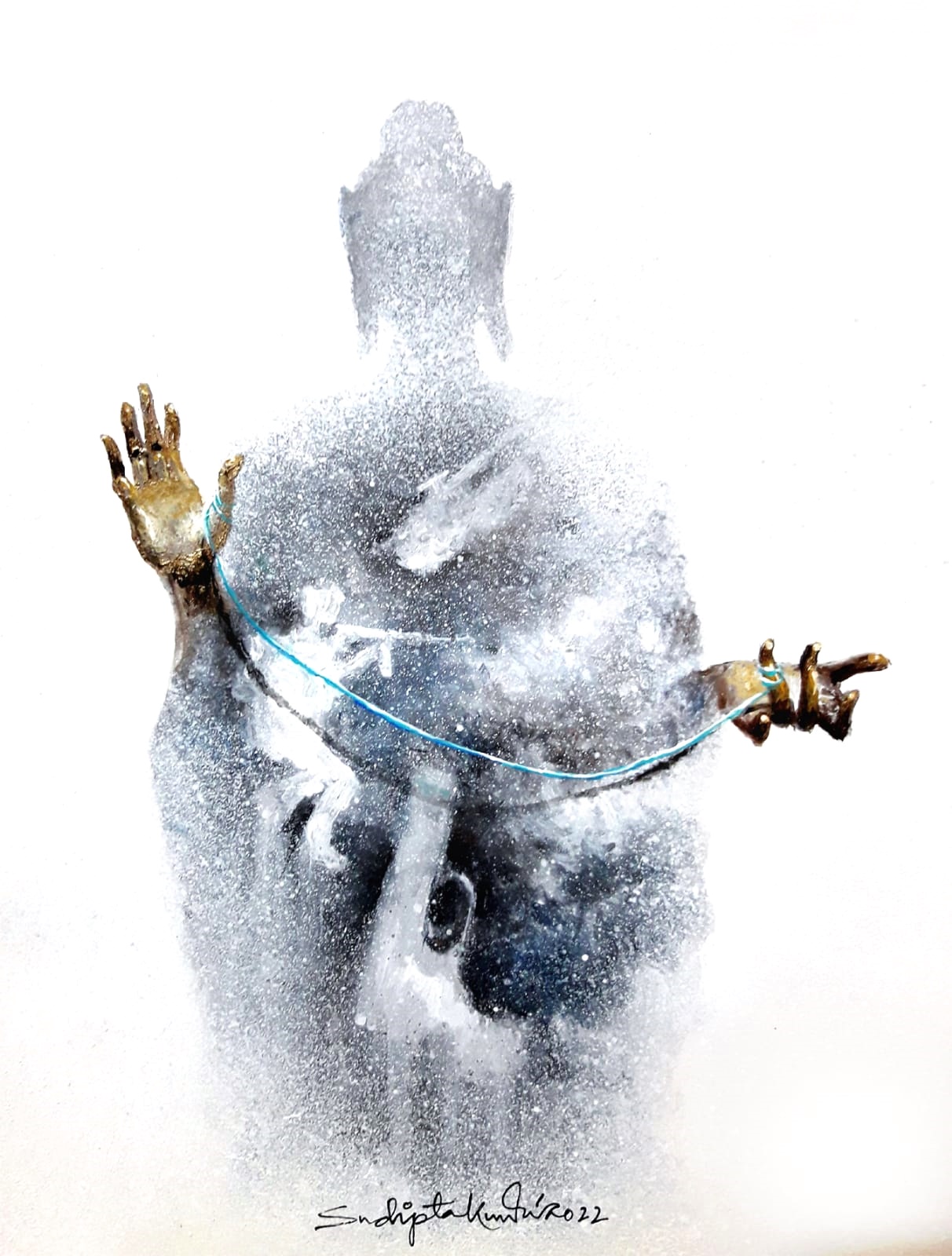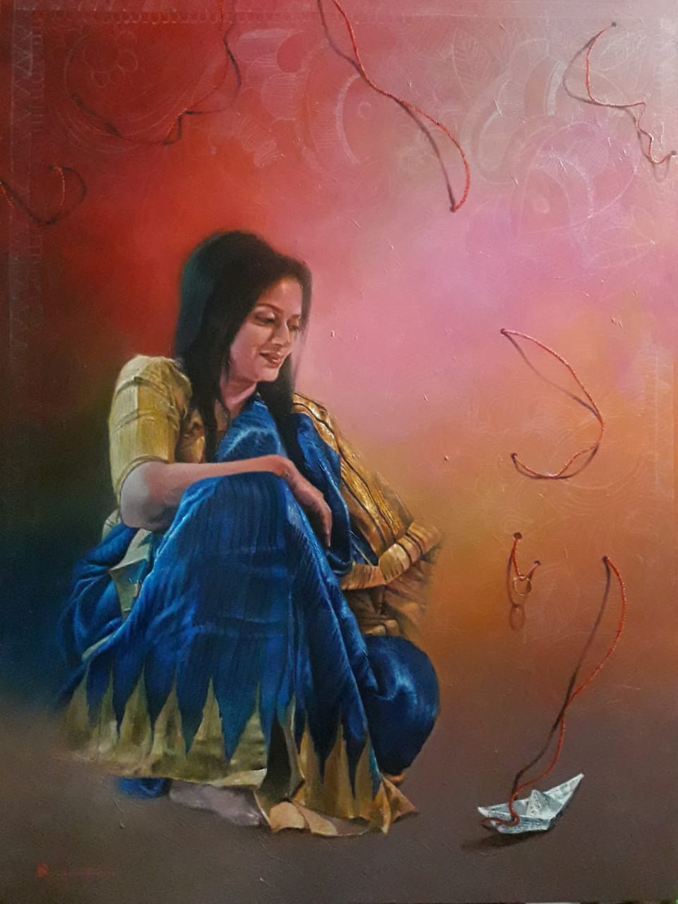 Sudipta Kundu works in realistic and mostly figurative themes, influenced by the people he sees around. He uses light and texture in his canvases, lending the images a surreal effect, and adds motifs and objects to create points of interest. Taking advantage of dramatic moments, he wants the audience to "read" his paintings. In his words, "Self expression is very important to me. I do believe that whatever I paint should be simple and can be widely understood by the audience, as well as be soothing to the eyes."