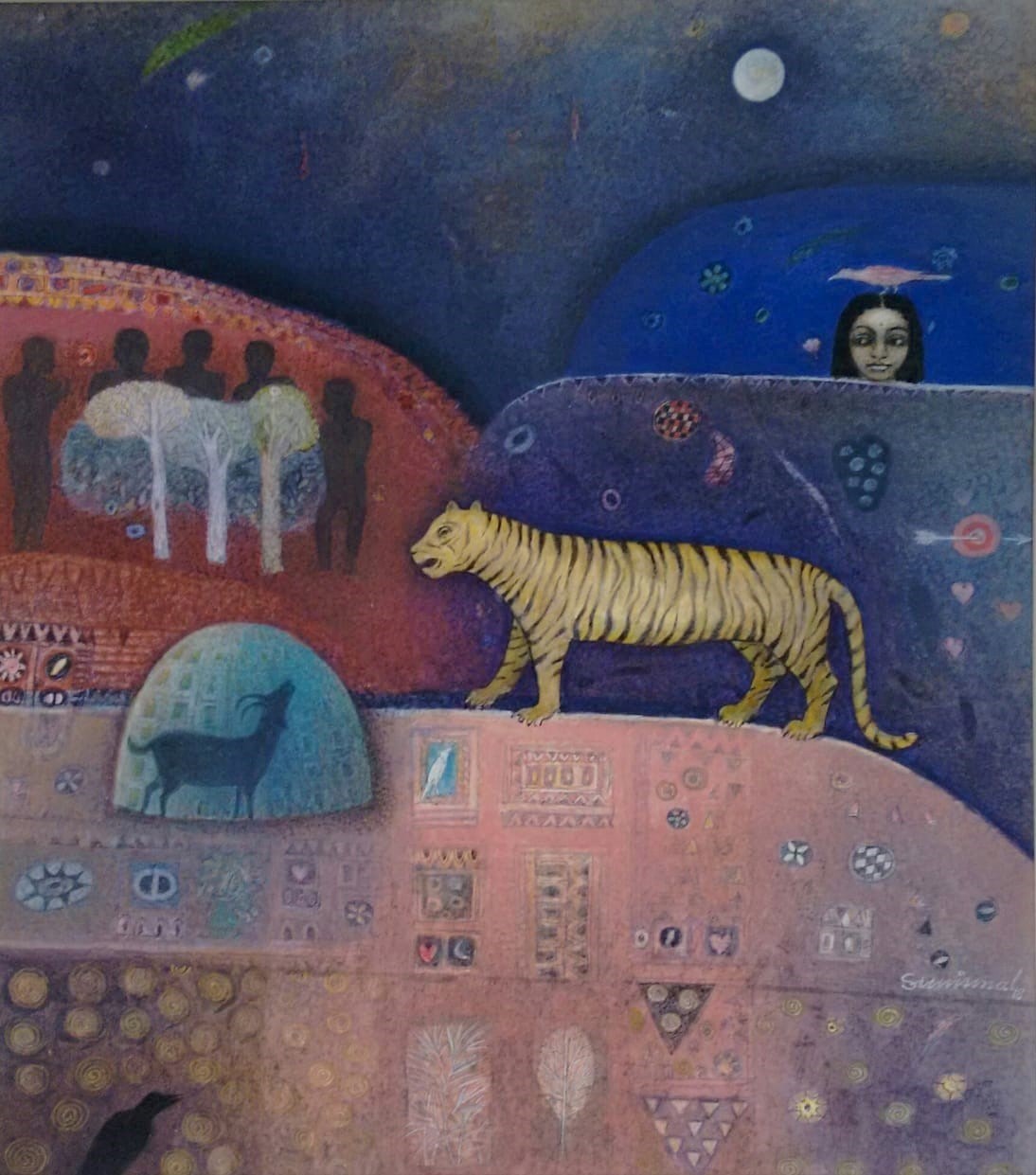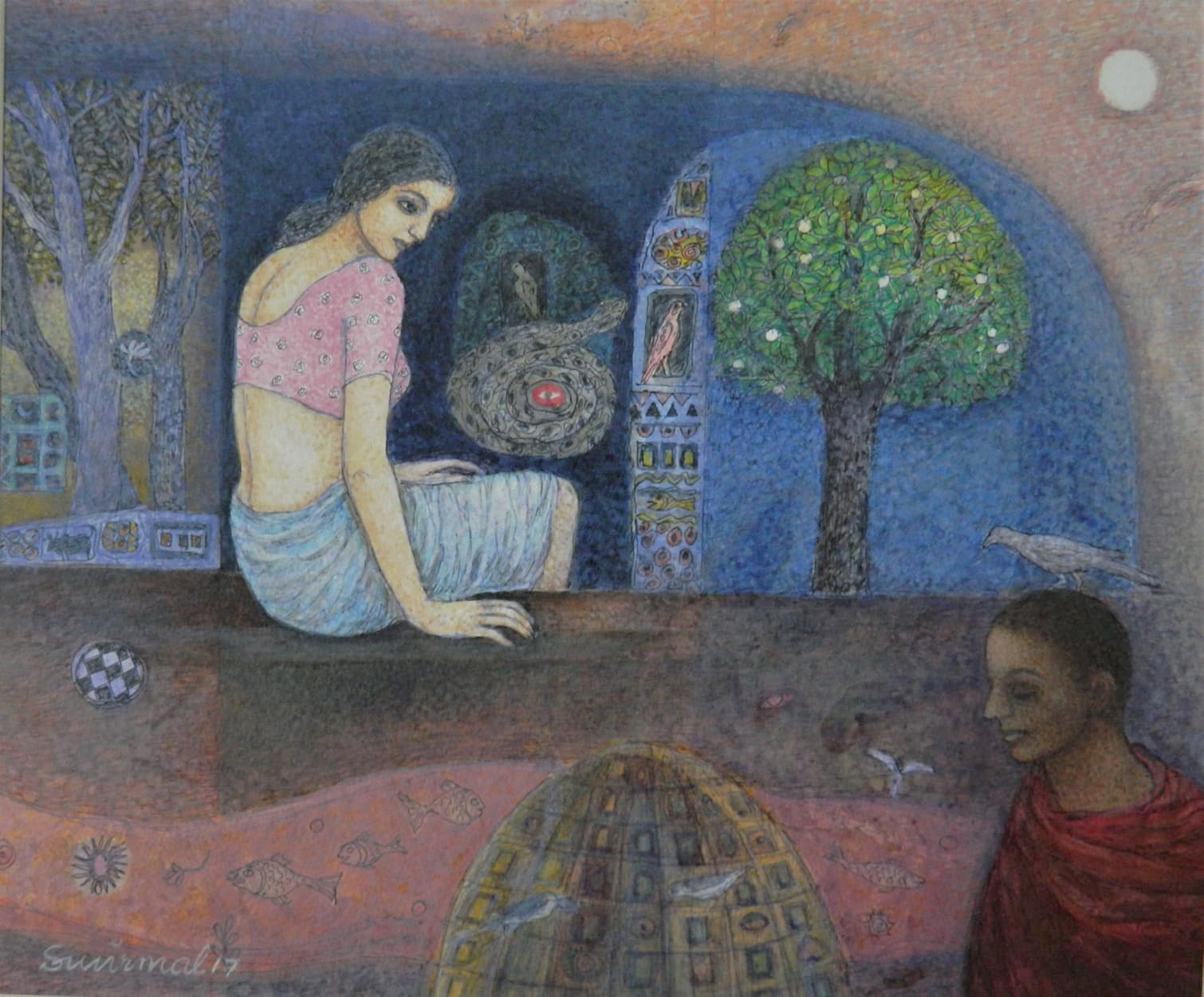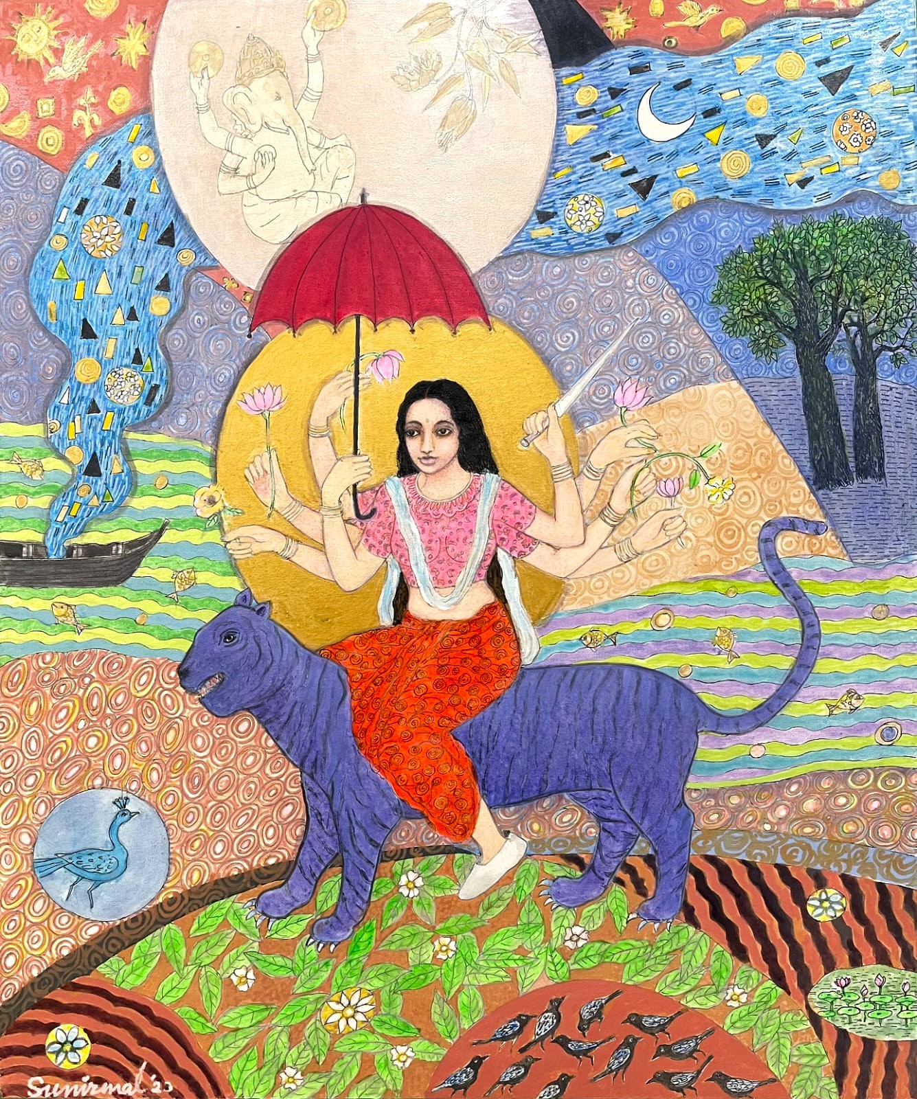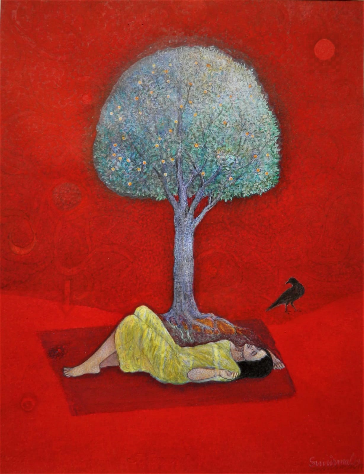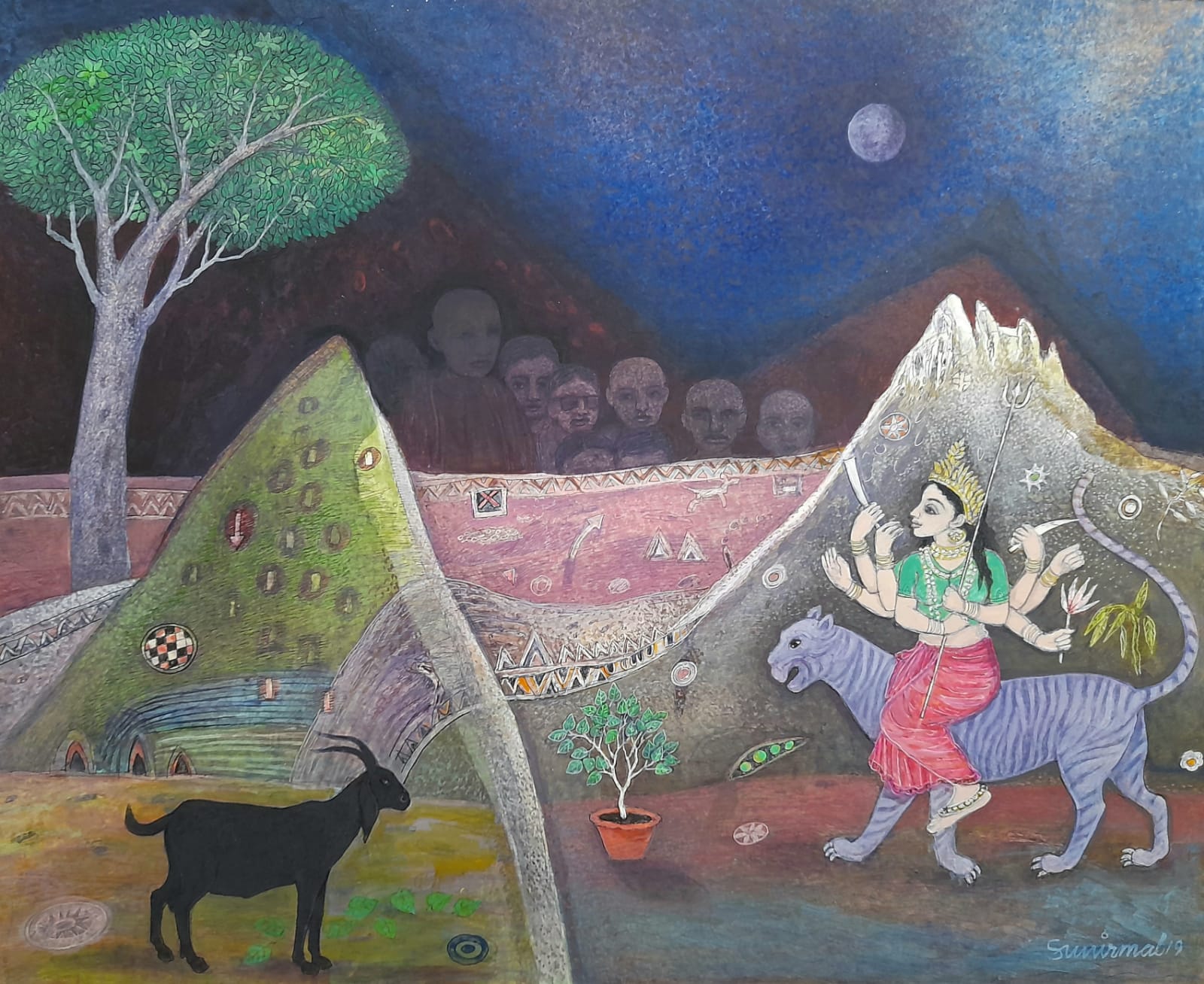 Trained as a printmaker, Sunirmal Maiti has been practicing painting for over twenty years. His works draw inspiration from mythology and literature, infusing his paintings with a sublime aesthetics of rich visual tempera traditions of India, to establish an exchange between contemporary expression and the echoes of the past that beckon wonder and exploration. Mythology, the Puranas & spiritualism have been subjects of Maiti's artistic interest since 2004. Through this exploration, he strives to enrich his understanding of the complexity of Indian identities, capturing the interplay of tradition and modernity in art.