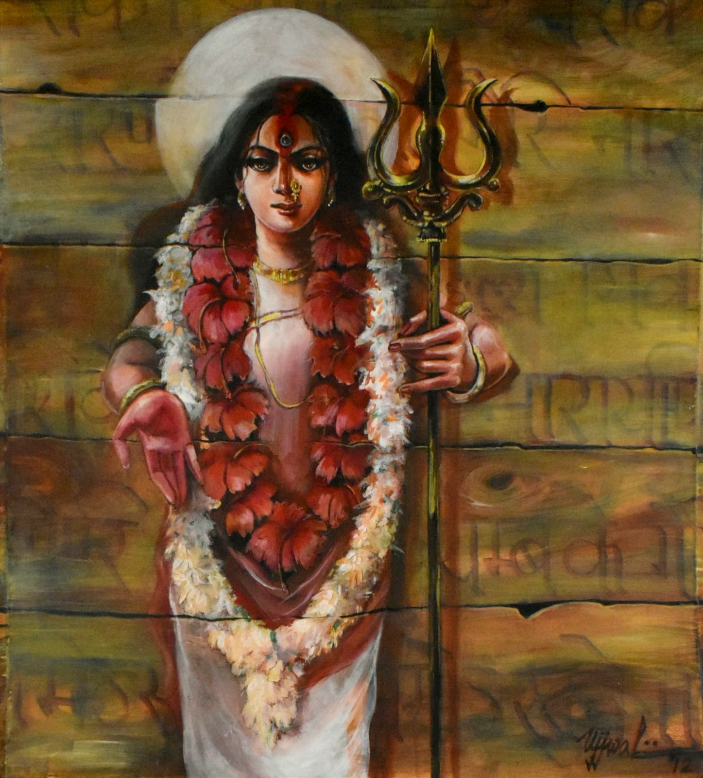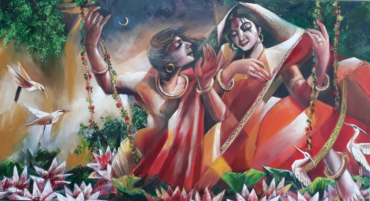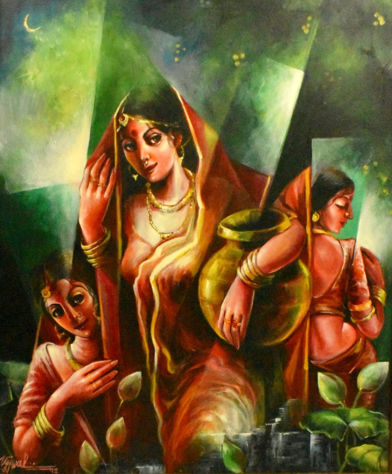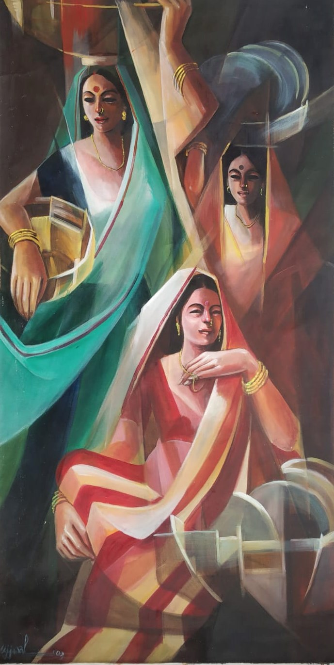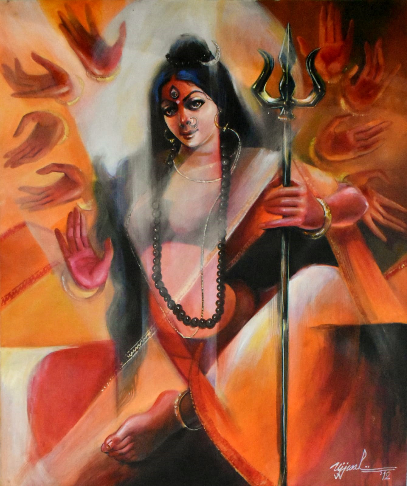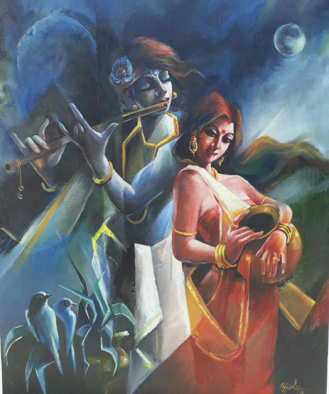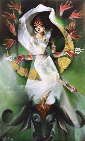 Ujjwal Debnath graduated from Calcutta University in 1991 and completed courses in Art Appreciation & Commercial Art. He received the Abanindranath Tagore Award in 1993. Ujjwal Debnath, who passed away this year, was a highly talented artist with a penchant for figurative works with beauty and lyricism. He specialized in traditional iconic figures which radiate an aura of charm and benevolence. His dramatic works have been created with a lot of love and in depth research into mythology and the scriptures, with a strong visual vocabulary.