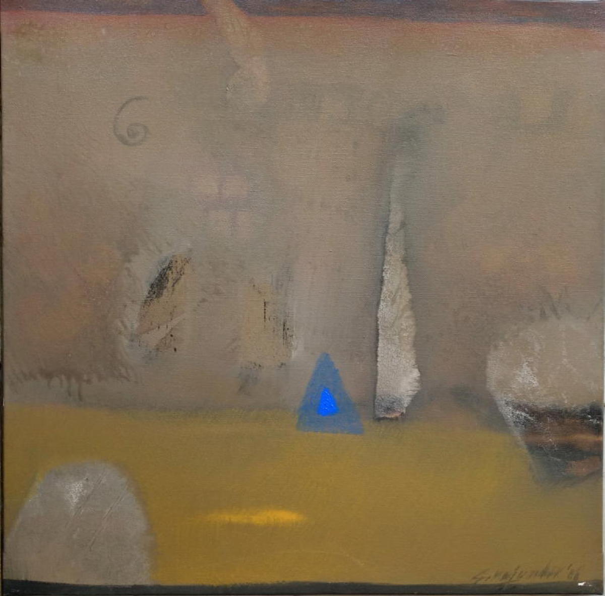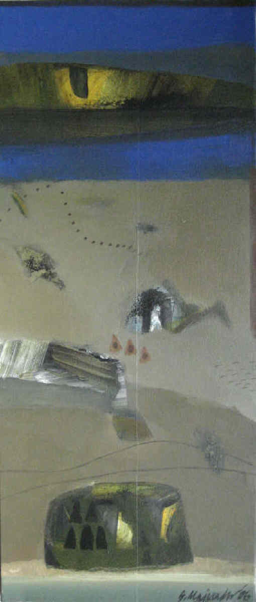 Samindra's paintings are, in a sense, quotes from the past. He offers us multiple readings of his encounters with experience, often existing simultaneously and oppositionally in the same work, indicating his undecidedness in adopting interpretative directionality. The interesting play between what appears to be a flat surface and barely-there deep space- the latter assuming the proportions of an epiphanic flash leading to a glimpse of the beyond" is in fact a counterpointing of attitudes. This reveals a dual tendency: to evaluate experience as a sedimentary formation (with the top layer visible, indicating, therefore, unseen presence which can be penetrated to expose areas of ultimate meaning/non-meaning, as also a simultaneous and contradictory impulse to discard experience as two-dimensional, weightless and insignificant.