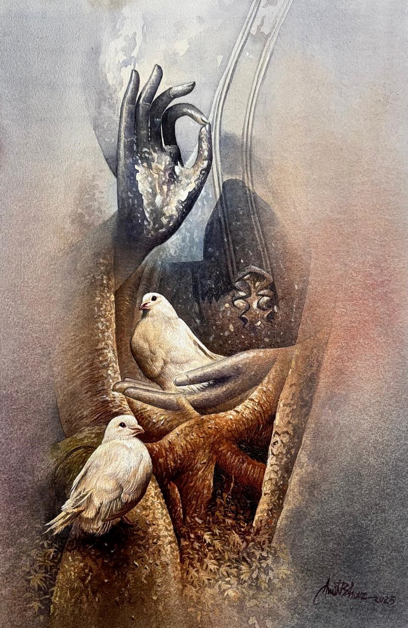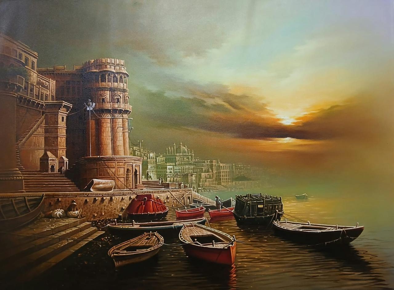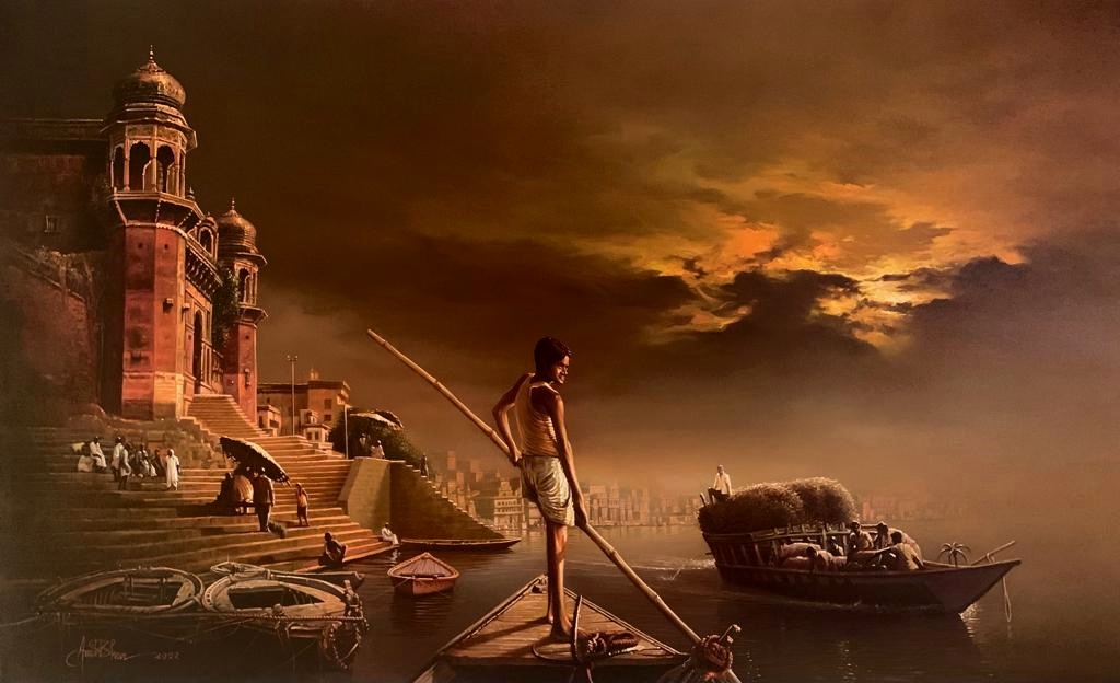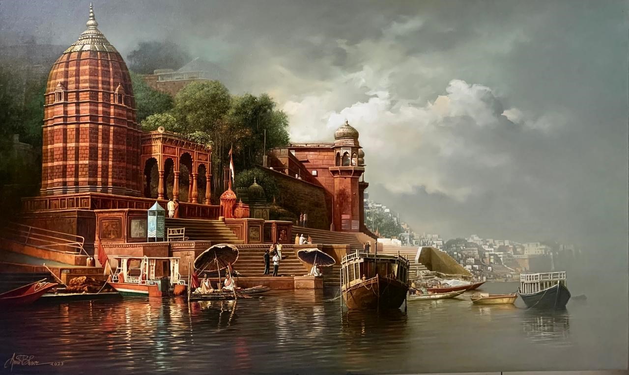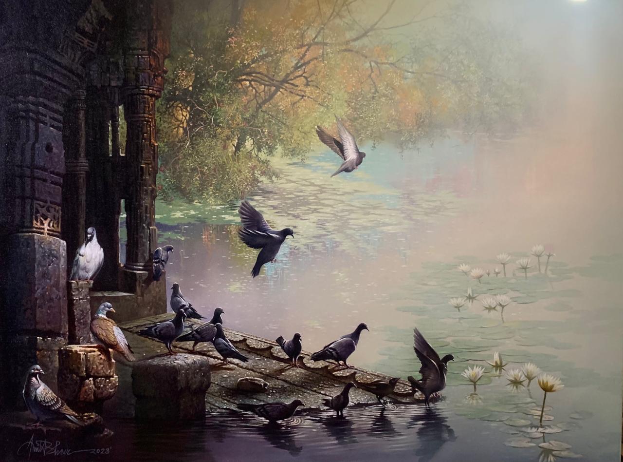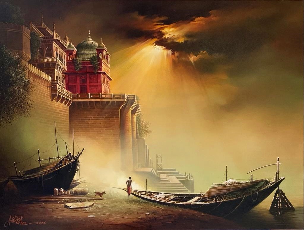 Mr. Amit Bhar's highly realistic yet subtly stylised works have his unique stamp. As in his Benares series, strongly figurative, soft but vivid hues make up his oil paintings, with close attention paid to both lighting and texture. Amit speaks of his style as 'A new semi realistic technique of texturing with the realistic play of light and shade”. In a nut shell, his paintings let the viewer to re-examine the threshold between illusion and reality, between waking and dreaming.