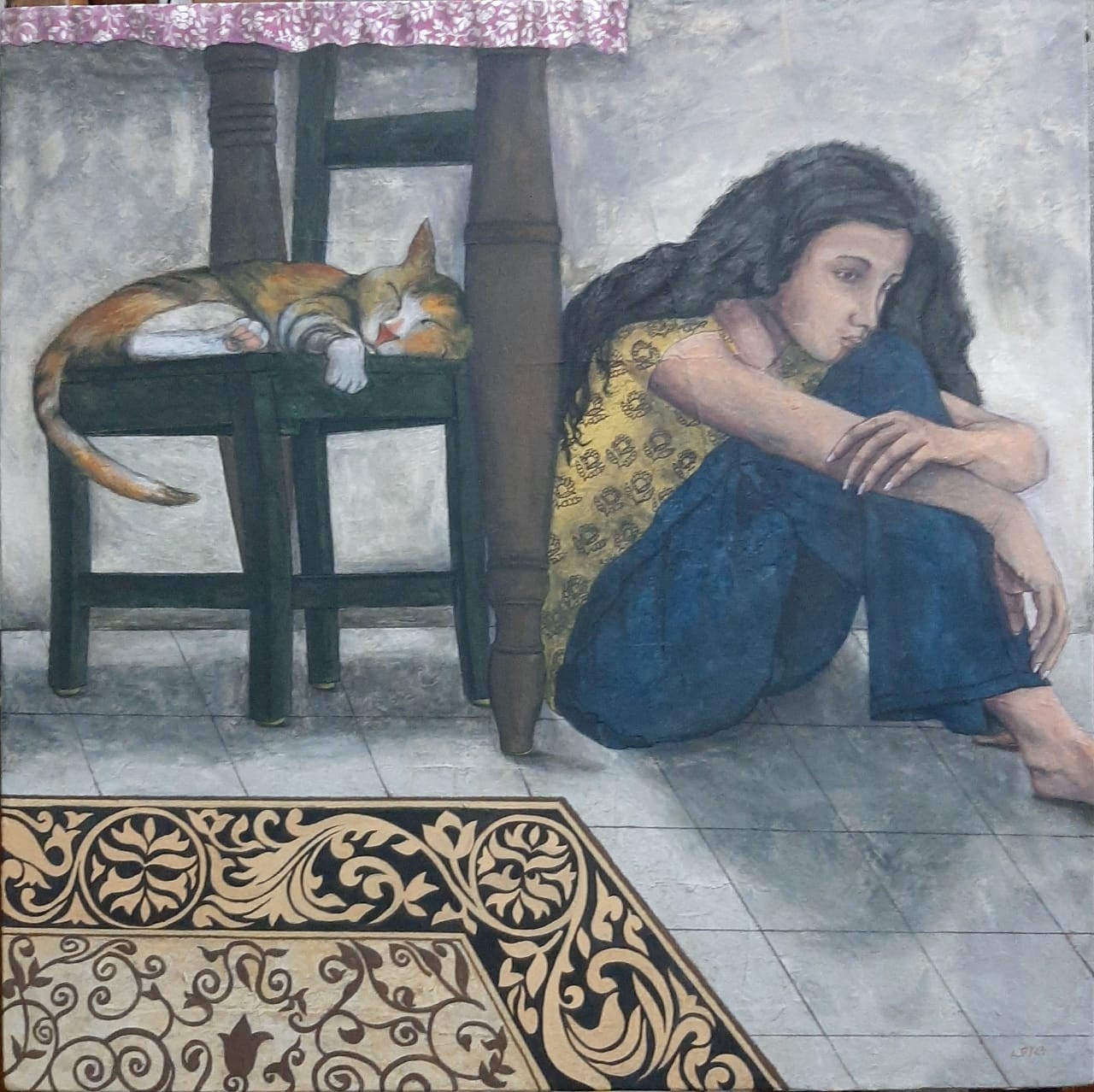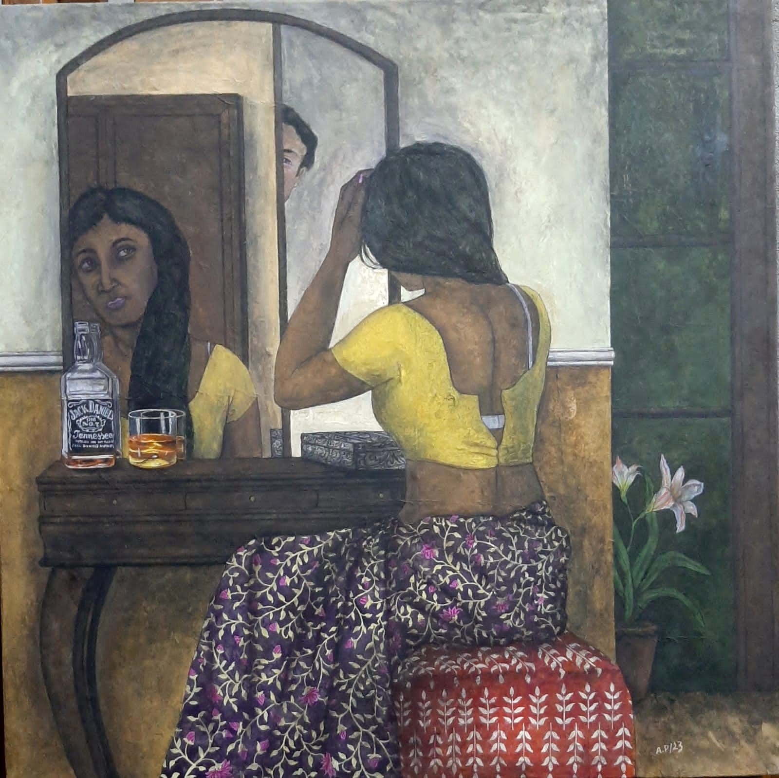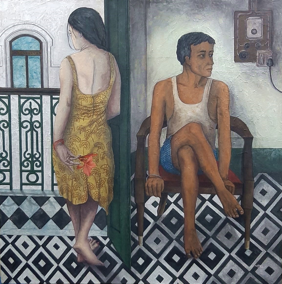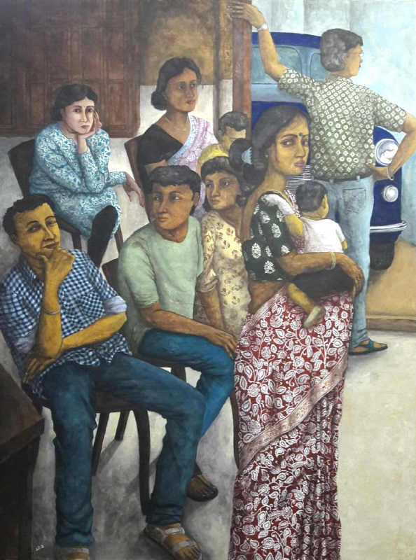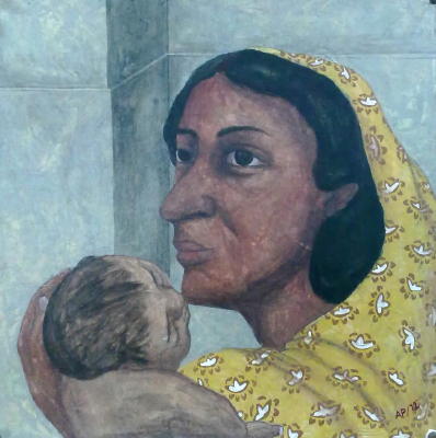 "Anjan has participated in Shows at the Birla Academy, National Exhibitions & Camlin India and is a Certificate of Merit awardee. He has chosen the tougher medium of Tempera on canvas pasted with Nepalese rice paper to give it body and the illusion of a cracked texture. Naturally ground vegetable pigments are combined with a paste from the babool tree and used as a binder. This technique results in a superb matt finish, with a phenomenal longevity. Anjan has been trained in the school of Indian miniature Painting, which is reflected in his use of flat colours & clever use of negative & positive space, vs the Western school of painting, which relies more on bringing its subjects to life through light, shade & perspective. There is a tendency to give a rich network of intricate patterns symbolizing the labyrinth of the character's thought process & inner beauty or turmoil, as the case may be. Anjan's subjects are a statement on society, reflected through facial expressions & body language of his characters. Sometimes, it is a comment on poverty or old age and at others, a satire on the wealthy. It is that particular moment which counts, in a language of its own."