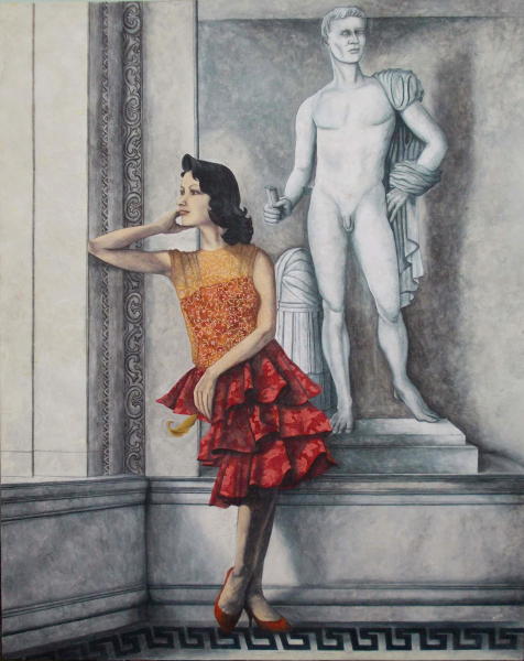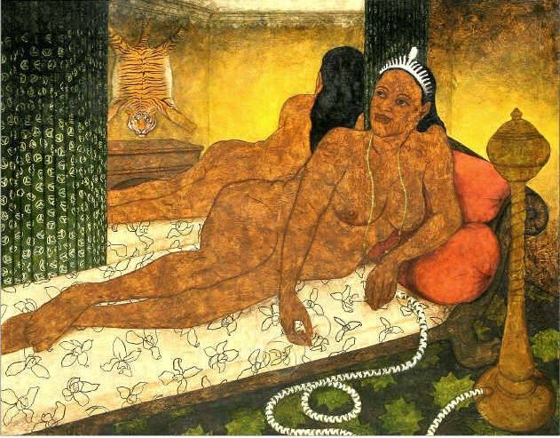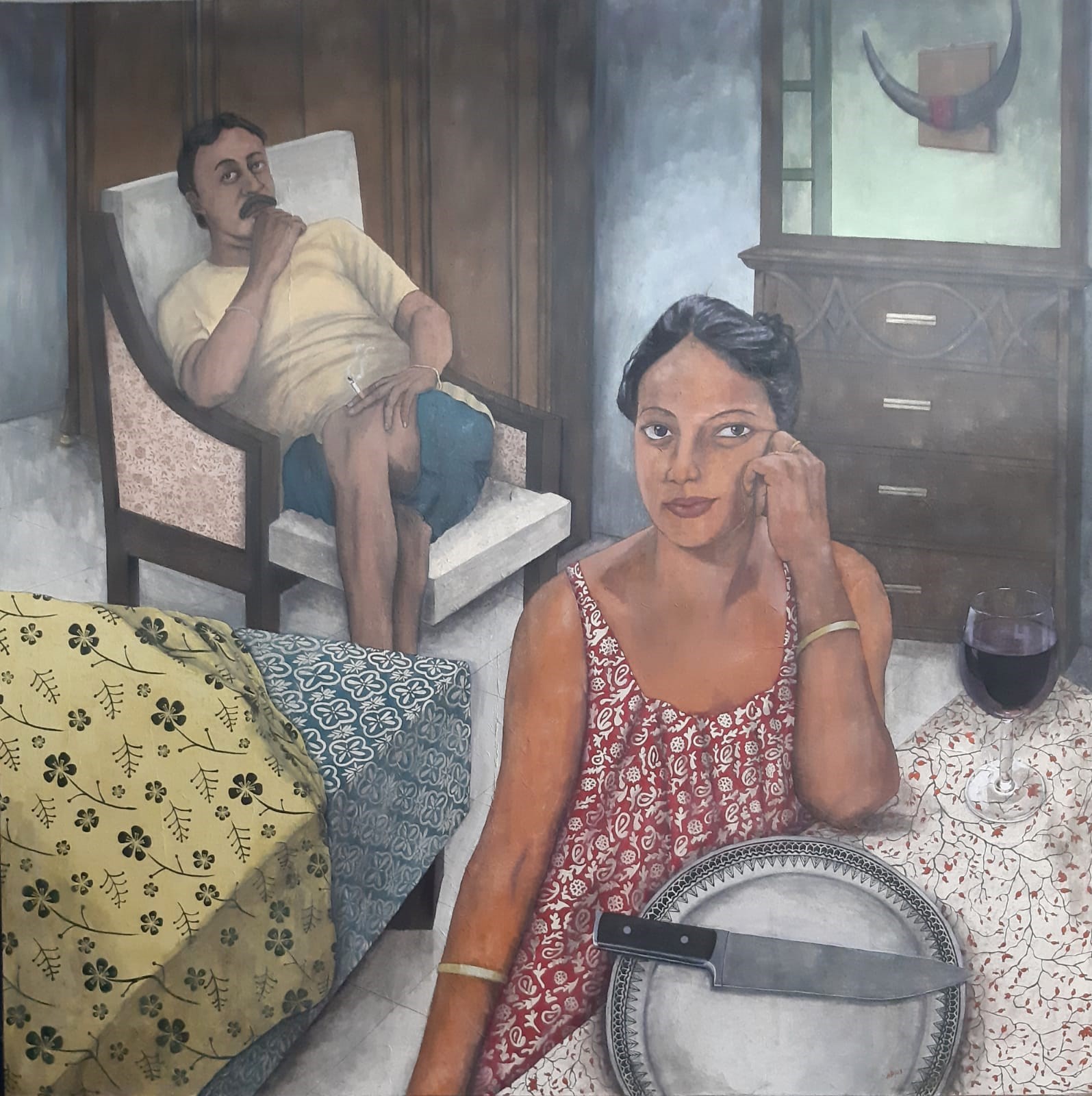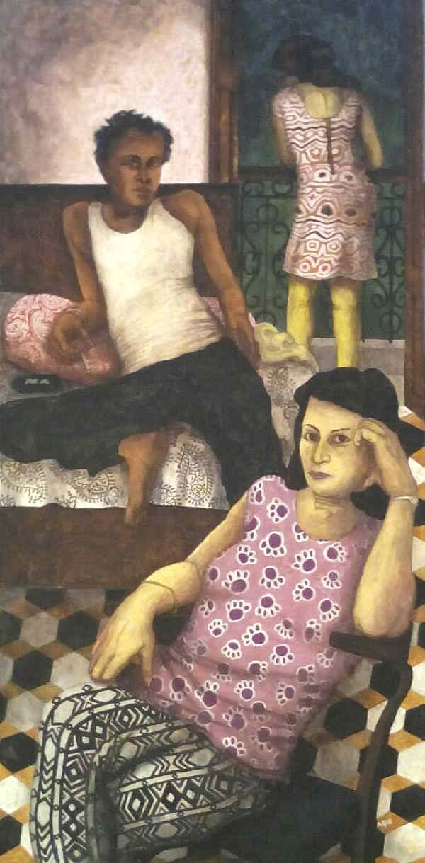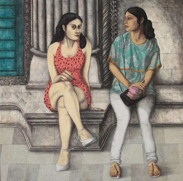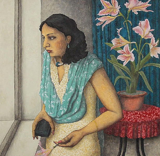 "Anjan has participated in Shows at the Birla Academy, National Exhibitions & Camlin India and is a Certificate of Merit awardee. He has chosen the tougher medium of Tempera on canvas pasted with Nepalese rice paper to give it body and the illusion of a cracked texture. Naturally ground vegetable pigments are combined with a paste from the babool tree and used as a binder. This technique results in a superb matt finish, with a phenomenal longevity. Anjan has been trained in the school of Indian miniature Painting, which is reflected in his use of flat colours & clever use of negative & positive space, vs the Western school of painting, which relies more on bringing its subjects to life through light, shade & perspective. There is a tendency to give a rich network of intricate patterns symbolizing the labyrinth of the character's thought process & inner beauty or turmoil, as the case may be. Anjan's subjects are a statement on society, reflected through facial expressions & body language of his characters. Sometimes, it is a comment on poverty or old age and at others, a satire on the wealthy. It is that particular moment which counts, in a language of its own."